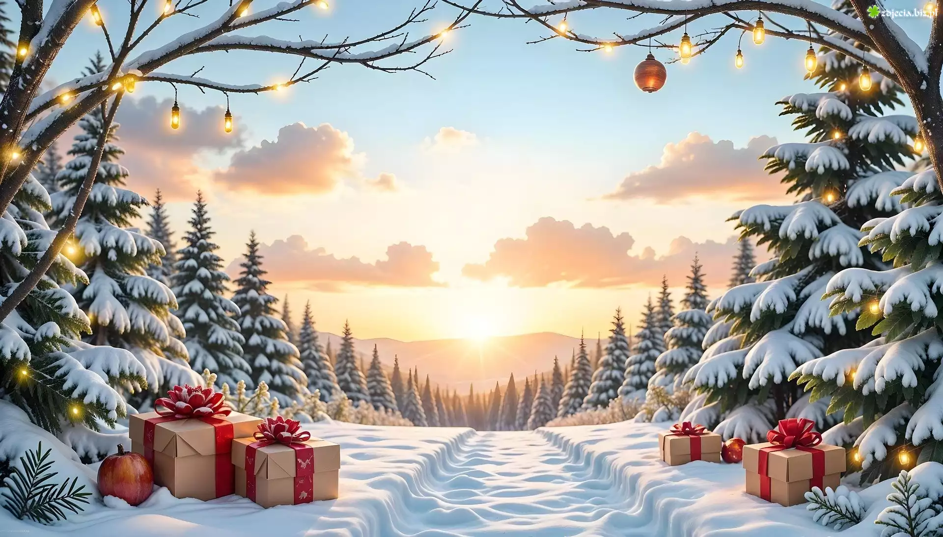 Zdjęcie Zima, Prezenty, Choinki, Śnieg, Drzewa