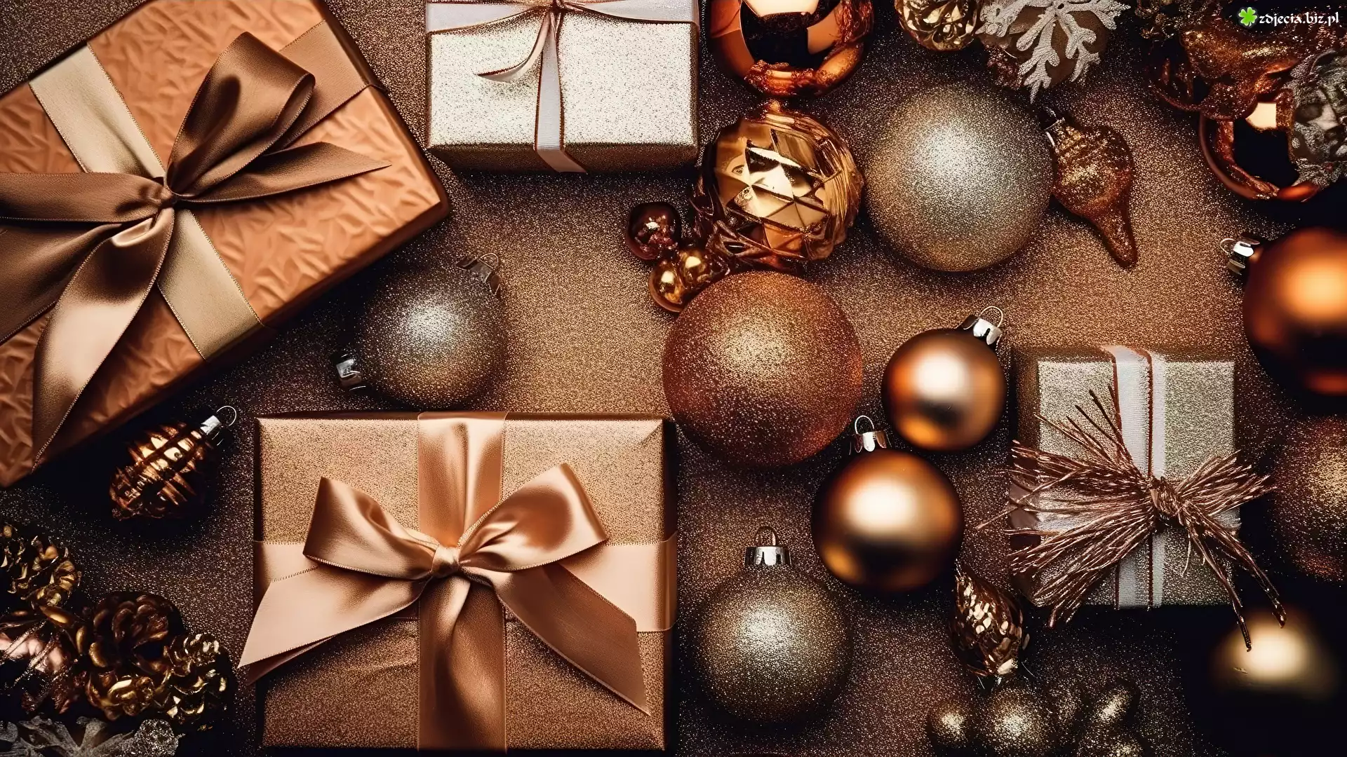 Zdjęcie Boże Narodzenie, Pudełka, Prezenty, Kokardki, Złote, Bombki