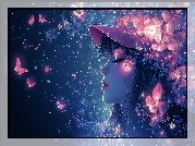 Zdjęcie Dziewczyna, Profil, Kapelusz, Motyle, Grafika