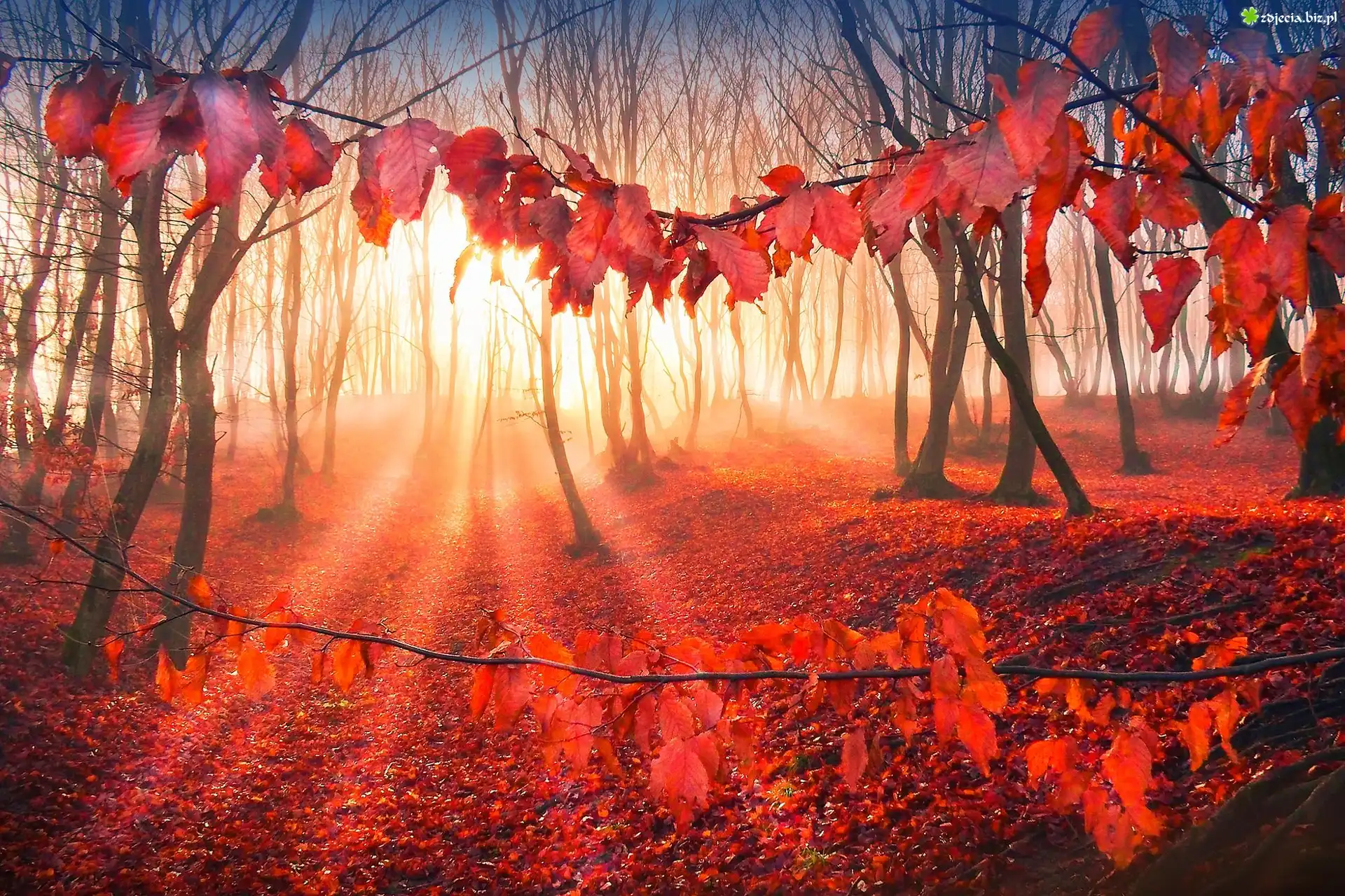 Zdjęcie Promienie, Słońca, Jesień, Las, Drzewa, Liście