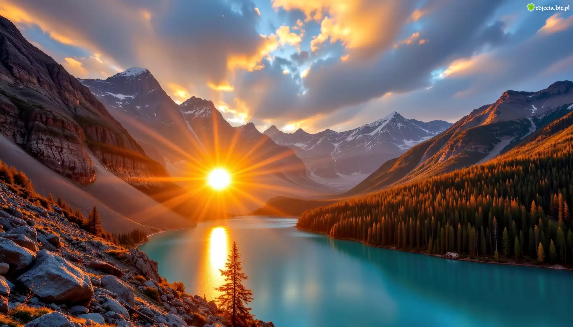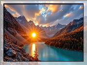 Zdjęcie Jezioro, Lasy, Góry, Promienie słońca, Grafika AI