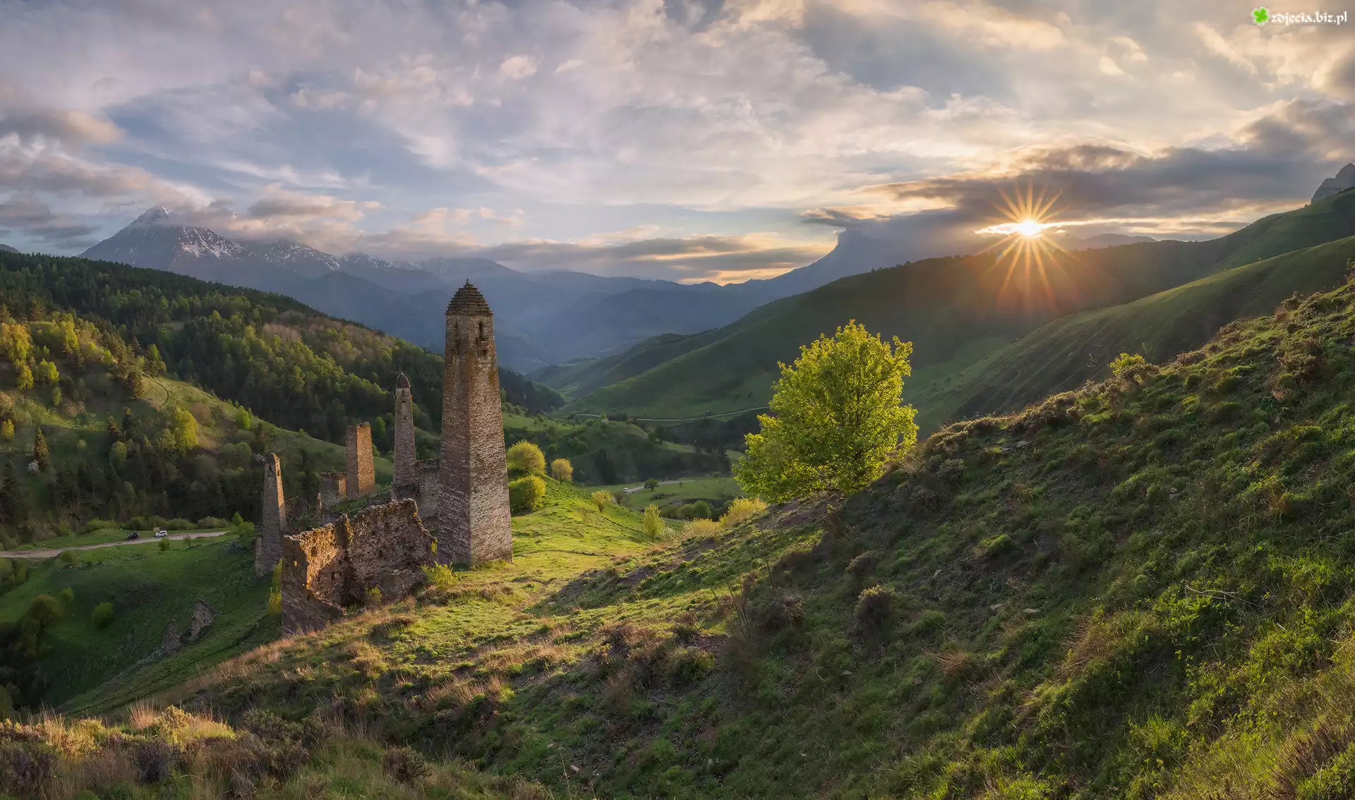 Zdjęcie Góry, Kaukaz, Ruiny, Wieże obronne, Promienie słońca, Drzewa, Erzi, Republika Inguszetii, Rosja |