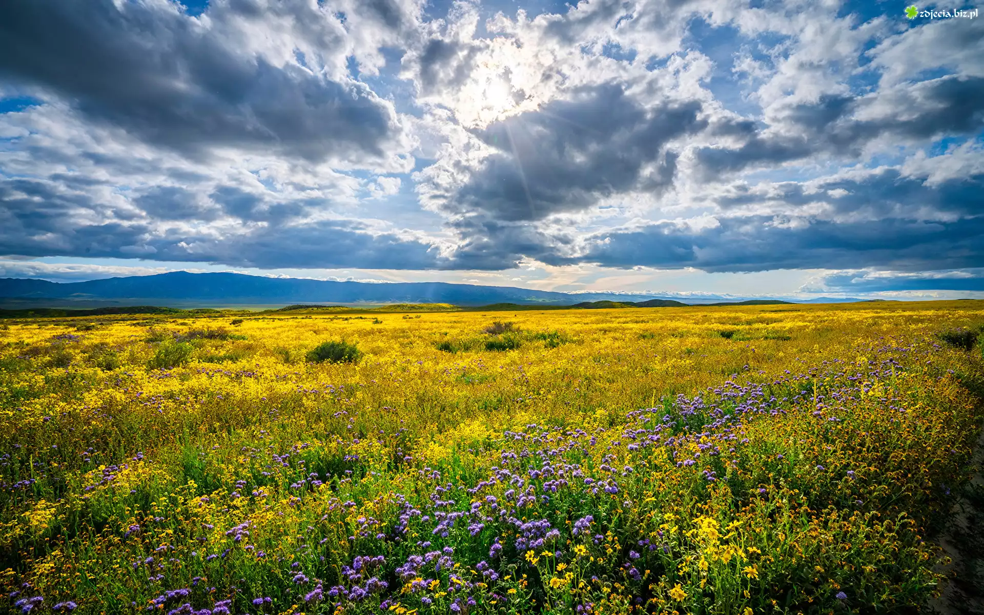 Zdjęcie Stany Zjednoczone, Kalifornia, Pomnik Narodowy Równiny Carrizo, Łąka, Kwiaty, Promienie słoneczne, Chmury |