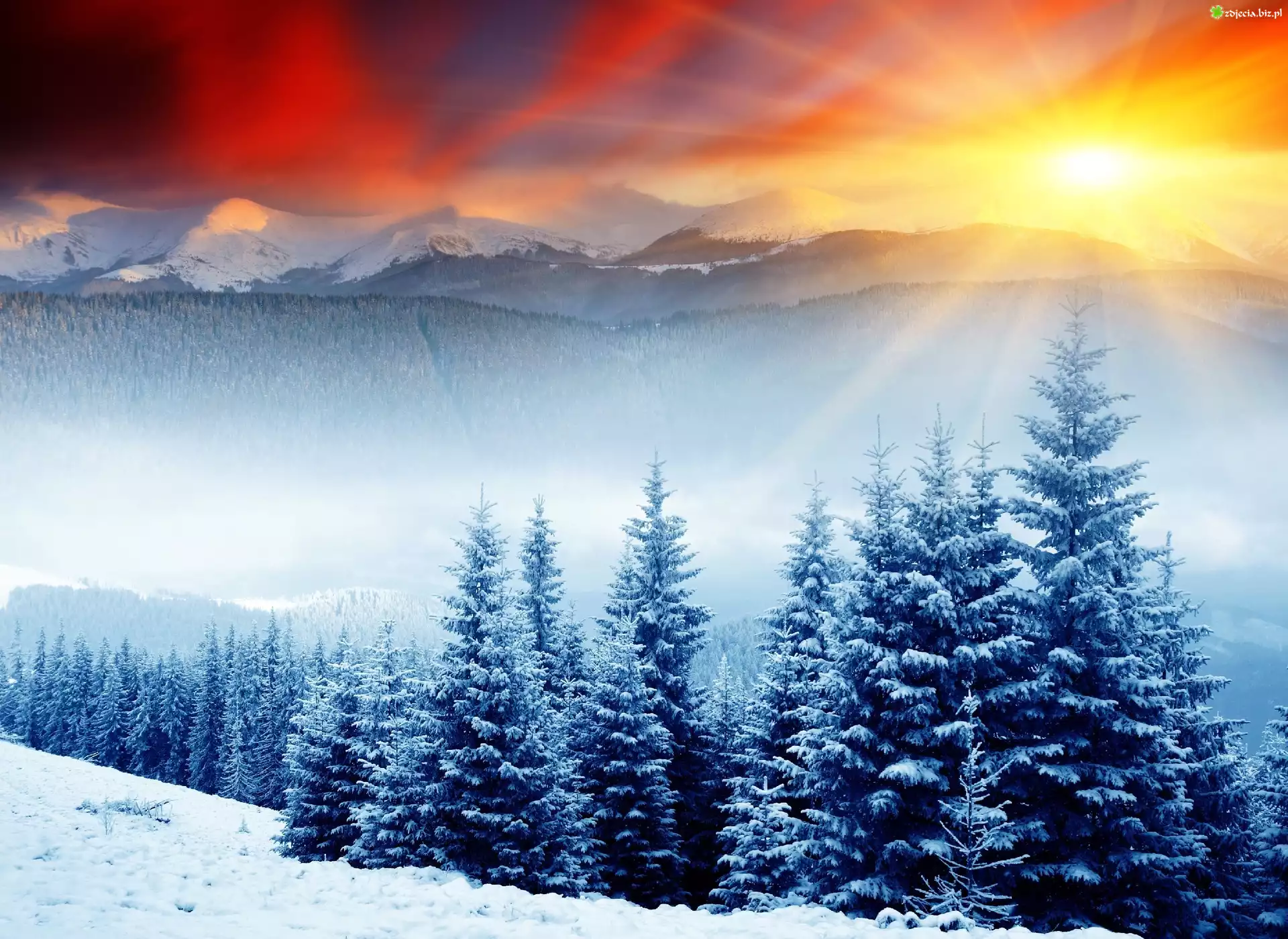 Zdjęcie Promienie, Słońca, Góry, Las, Zima