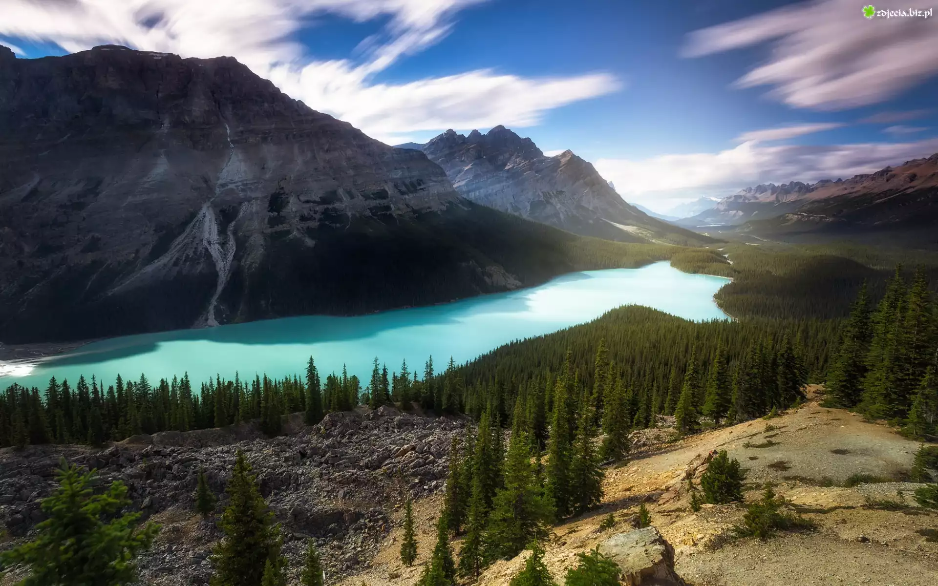 Zdjęcie, Park Narodowy Banff, Jezioro, Peyto Lake, Góry, Lasy, Chmury, Prowincja Alberta, Kanada