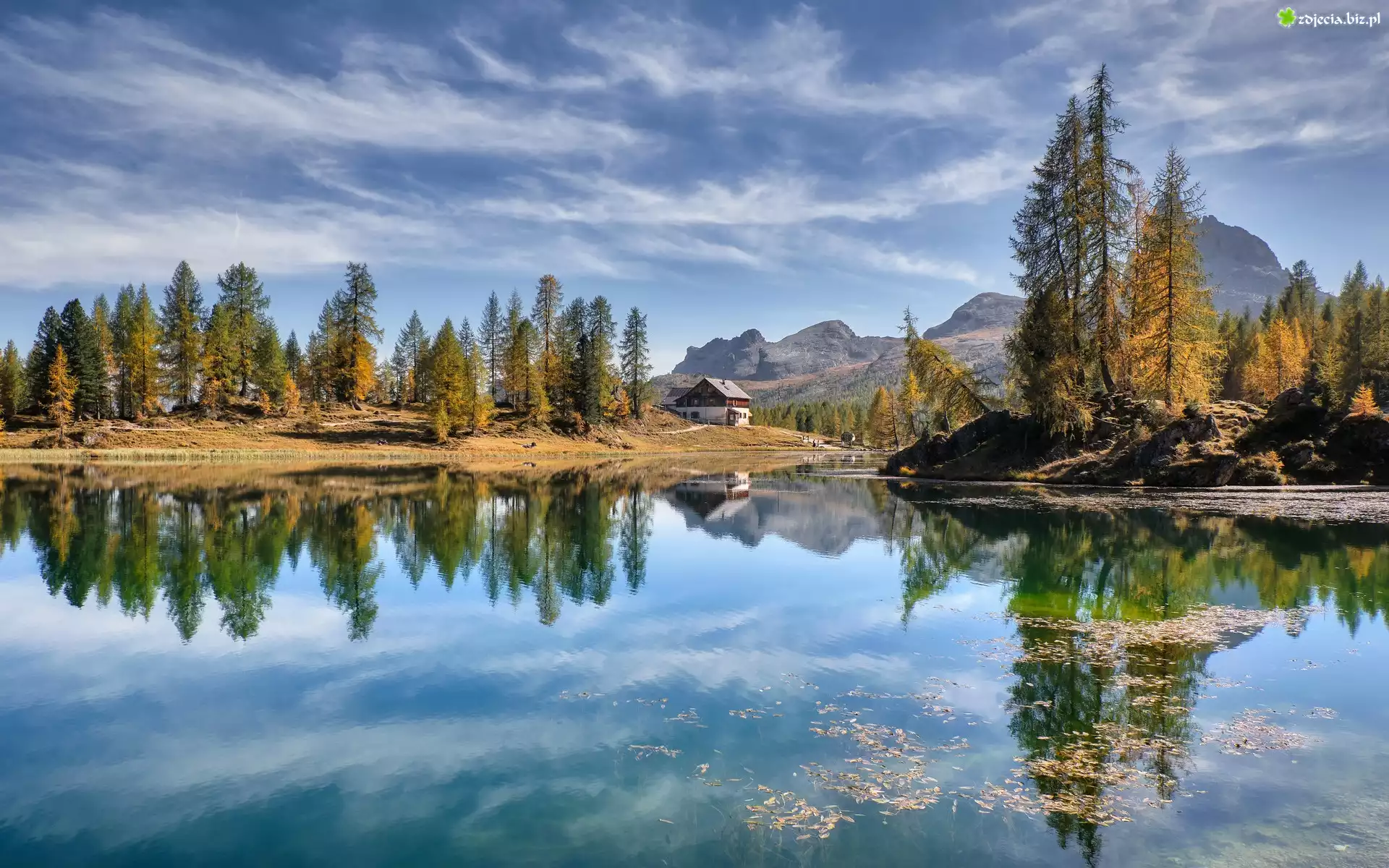 Zdjęcie Jezioro Lago Federa, Prowincja Belluno, Włochy, Góry Dolomity, Schronisko, Dom, Drzewa, Jesień, Odbicie |