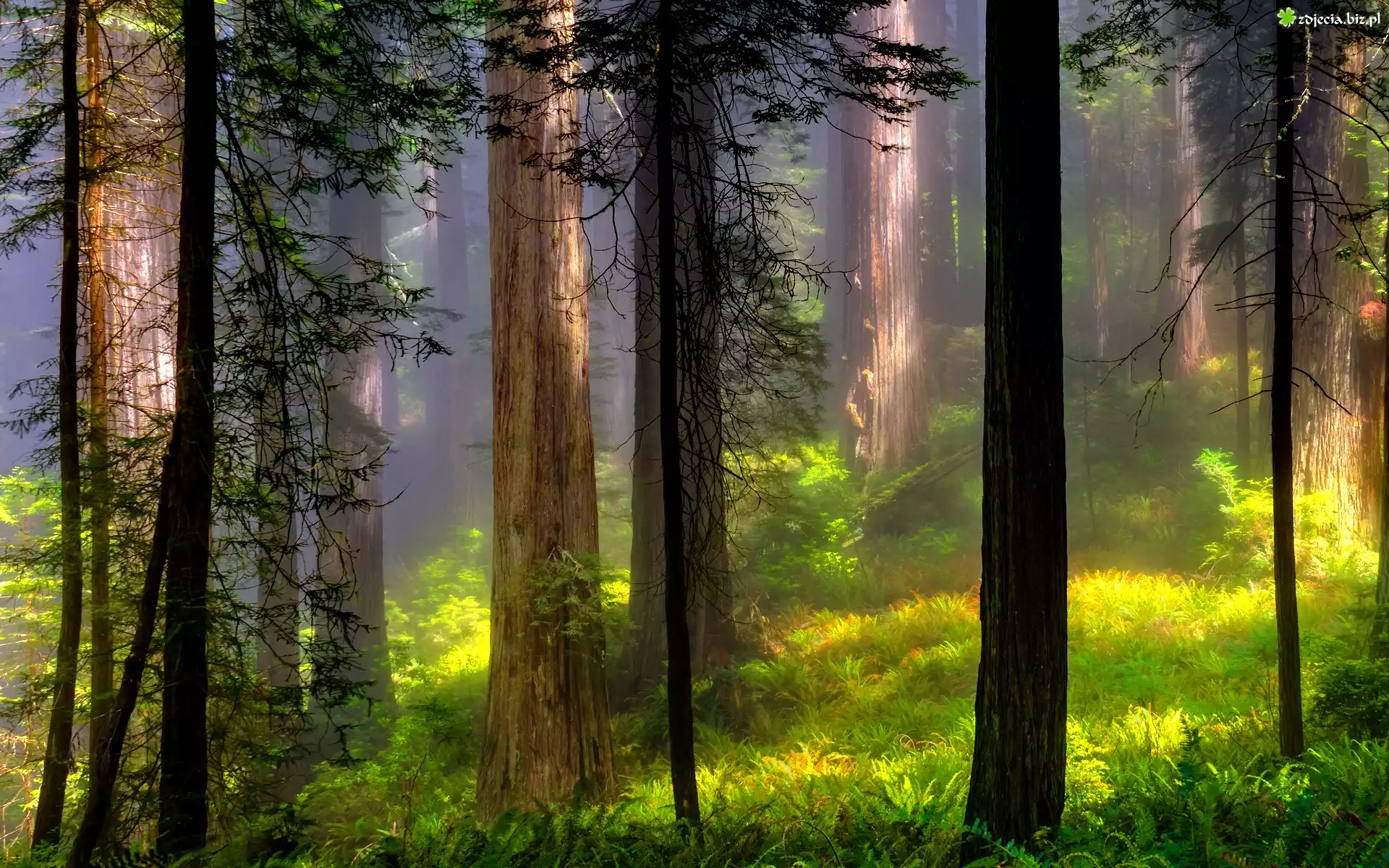 Zdjęcie Las, Przebijające, Światło, Mgła, Paprocie, Trawy, Wiosna