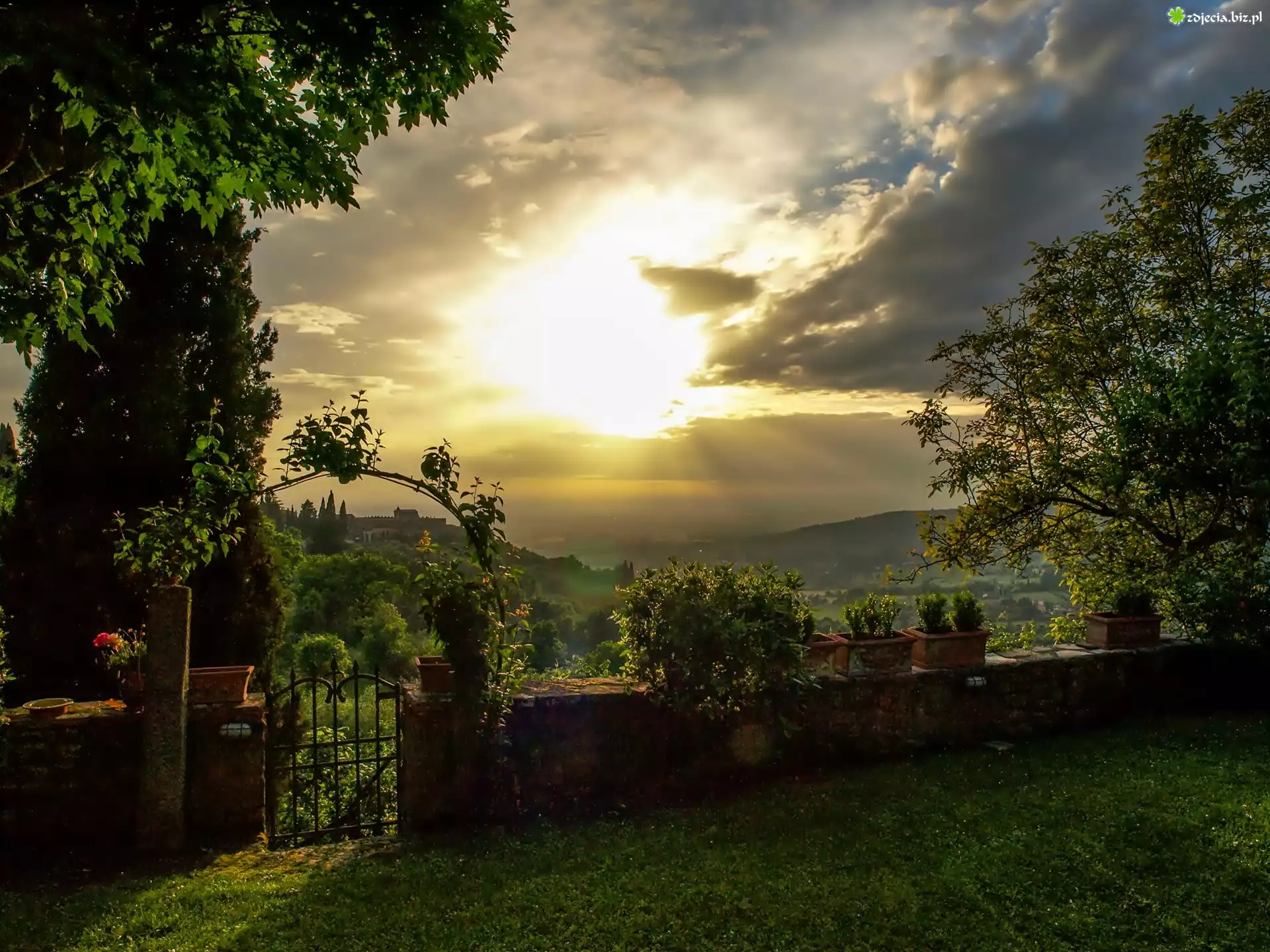 Zdjęcie, Przebijające, Światło, Ogród, Ogrodzenie, Drzewa
