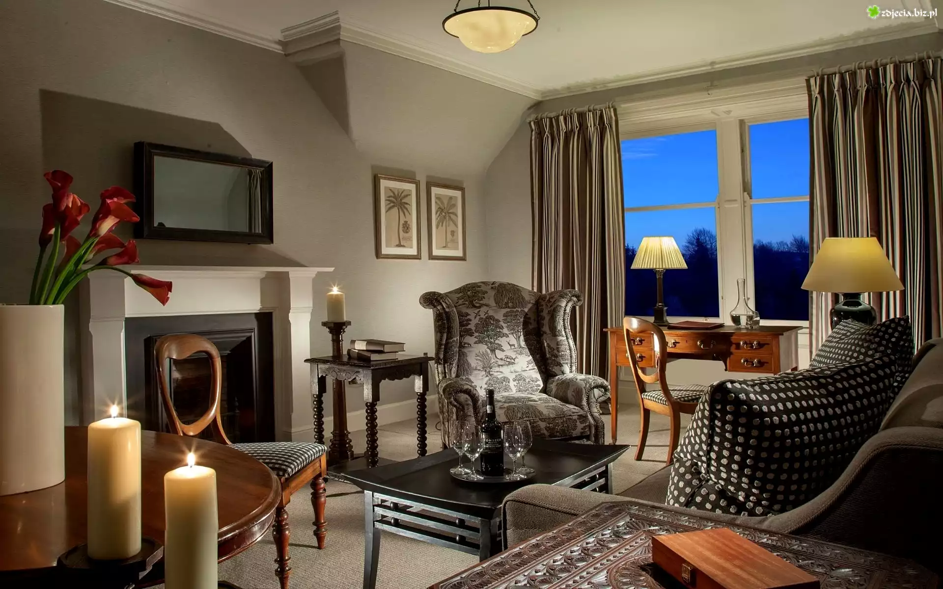 Zdjęcie Przytulny, Pokój, Kominek, Biurko, Kwiaty, Świece
