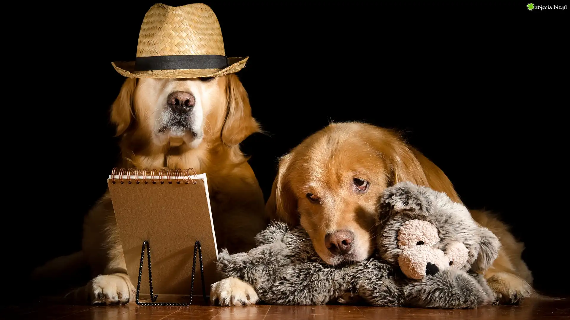 Zdjęcie Dwa, Psy, Golden retriever, Kapelusz, Brulion, Pluszak