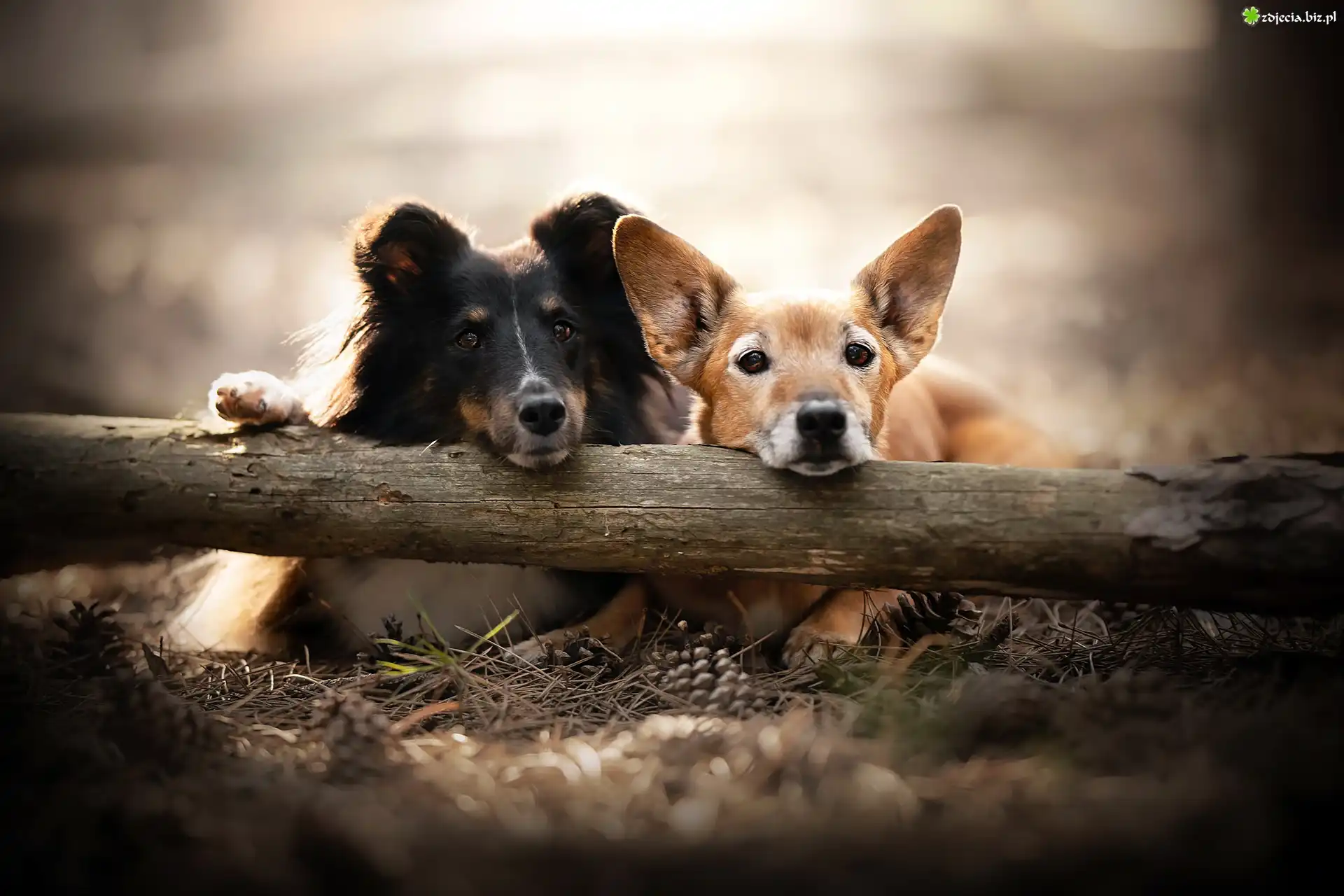 Zdjęcie Dwa, Psy, Owczarek szetlandzki, Kundelek, Kłoda, Drzewa, Szyszki