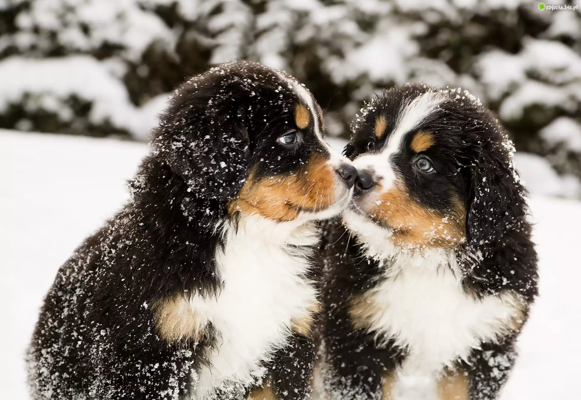 Zdjęcie Dwa, Psy, Berneńskie psy pasterskie, Szczeniaki, Śnieg, Zima