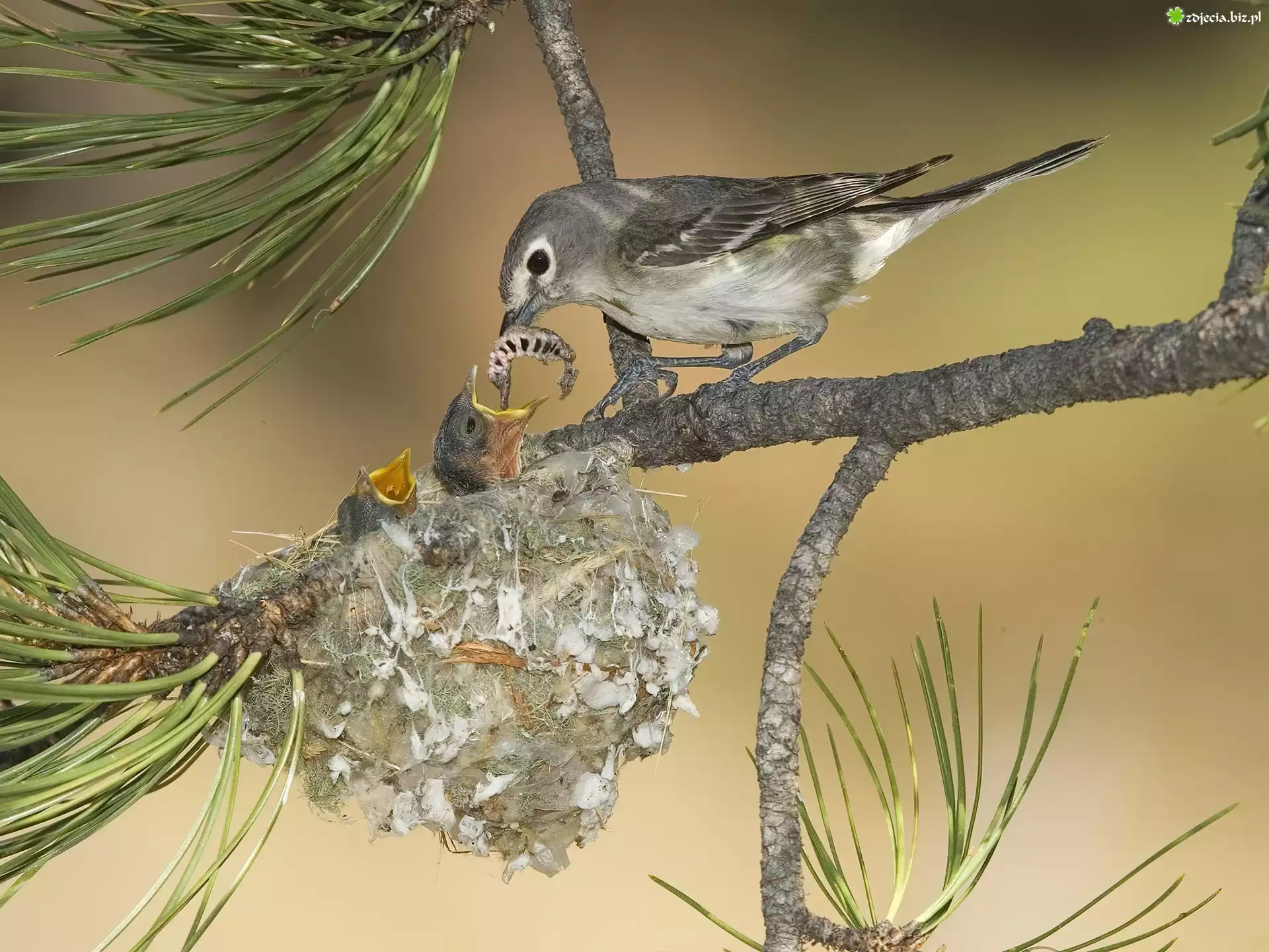 Zdjęcie Ptak, Gniazdo, Karmienie, Gałązka, Sosny