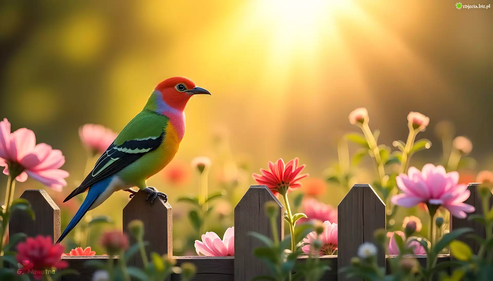 Zdjęcie Kolorowy, Ptak, Płot, Kwiaty, Grafika