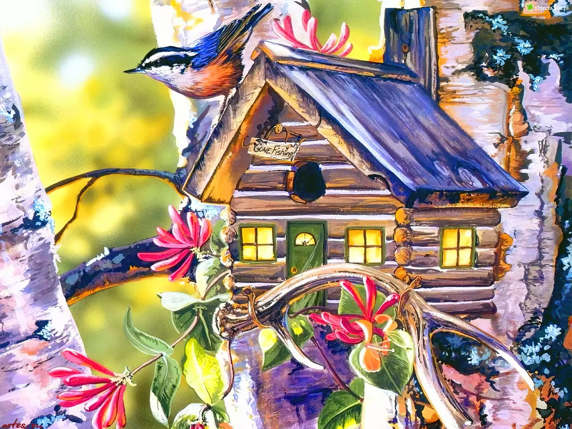 Zdjęcie Ptaki, Domek, Pnie, Drzew, Obraz
