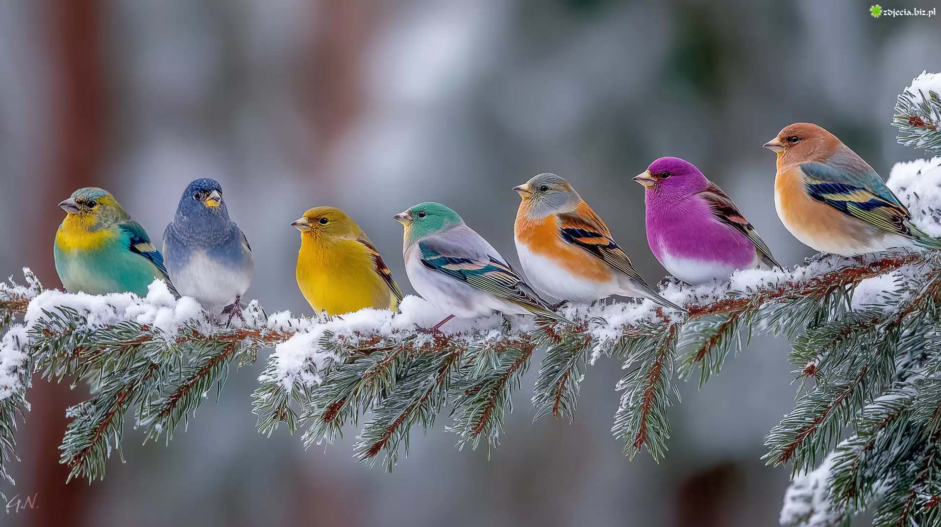 Zdjęcie, Kolorowe, Ptaki, Gałąź, Grafika AI