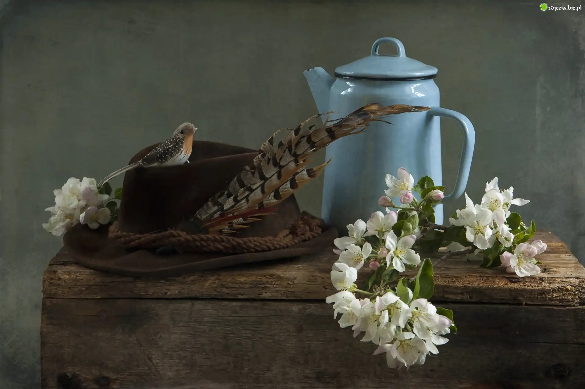 Zdjęcie, Kompozycja, Ptaszek, Kapelusz tyrolski, Piórko, Niebieski, Dzbanek, Kwiatki