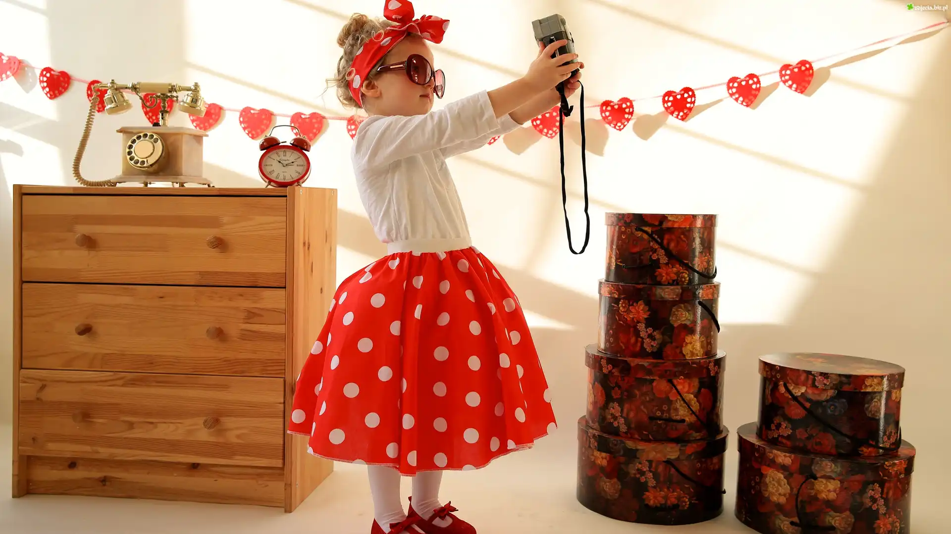 Zdjęcie Dziewczynka, Czerwona, Spódniczka, Kokarda, Okulary, Aparat fotograficzny, Selfie, Komoda, Pudełka |