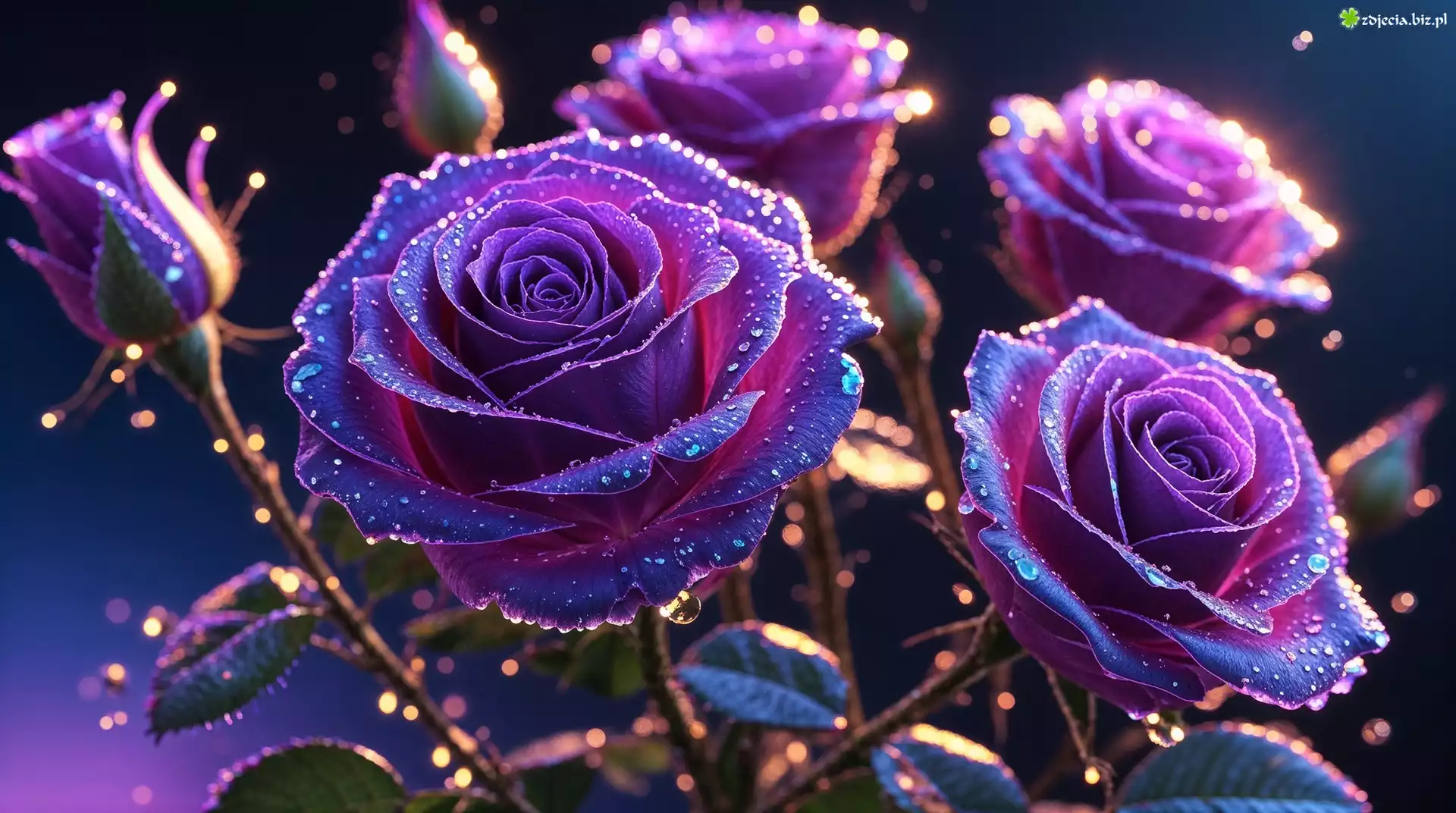 Zdjęcie Róże, Purpurowe, Kwiaty, Krople, Grafika