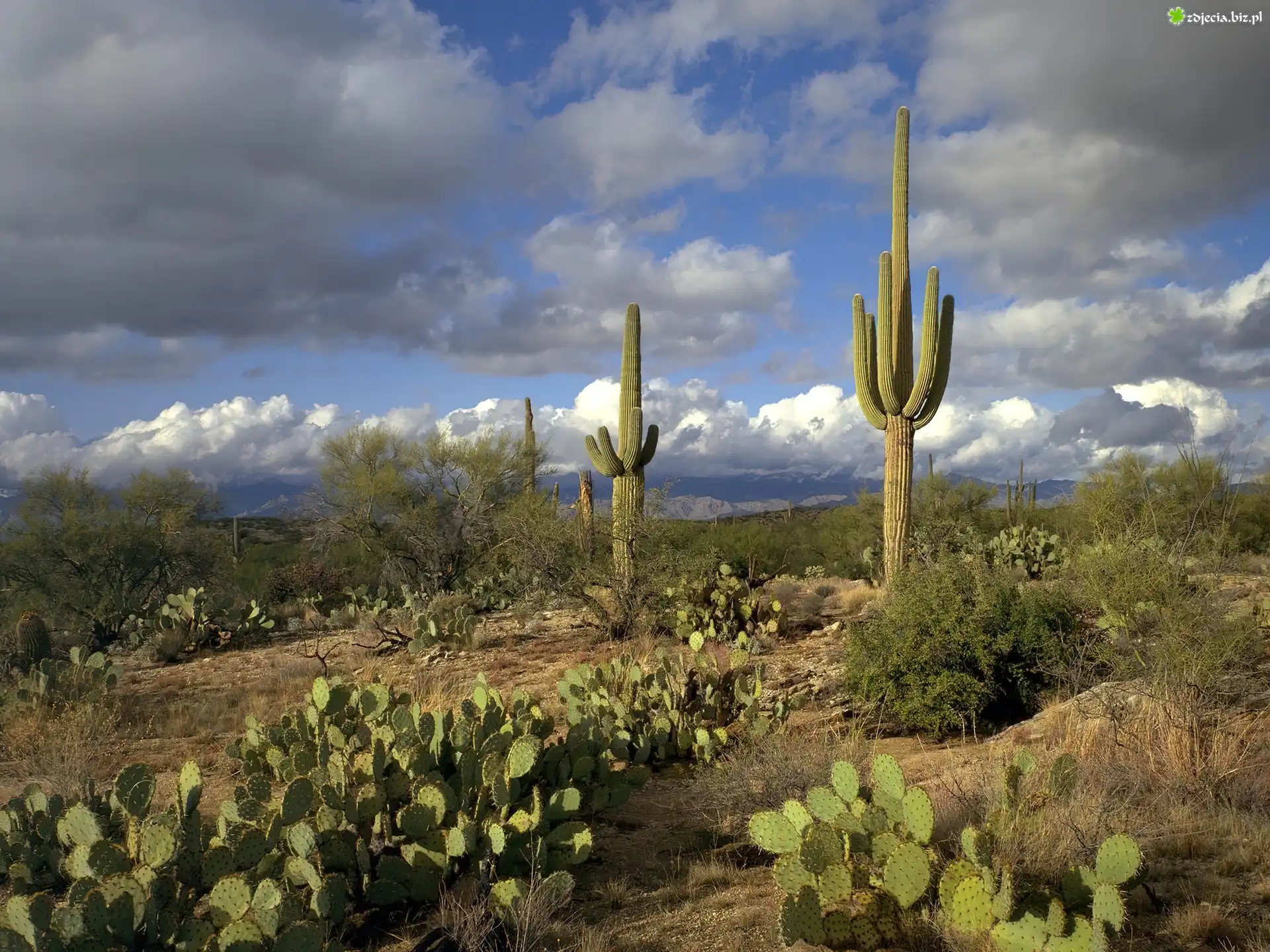 Zdjęcie Pustynia, Kaktusy, Opuncje, Karnegia olbrzymia, Saguaro, Chmury, Park Narodowy Saguaro, Stan Arizona, Stany Zjednoczone |