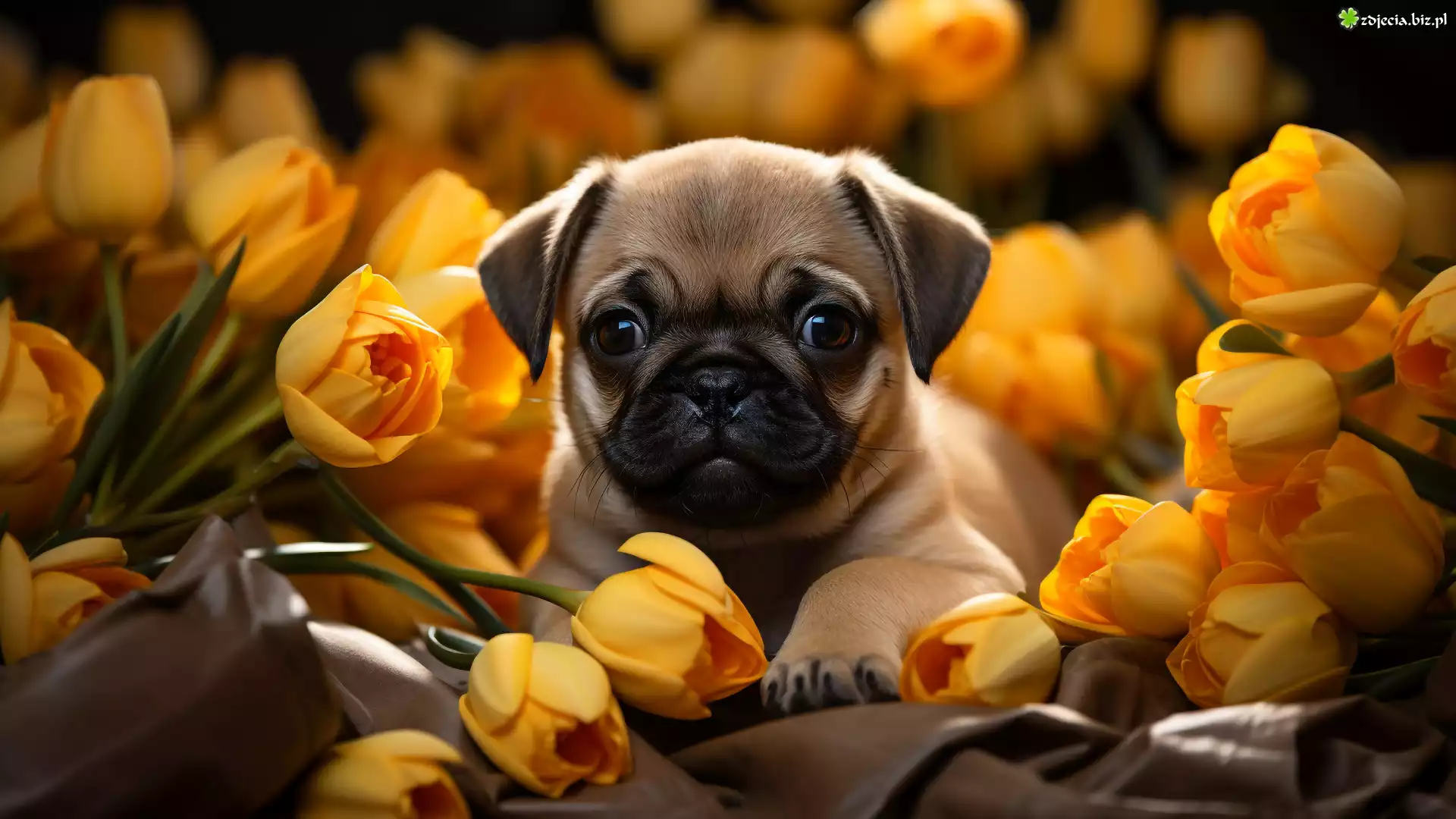 Zdjęcie, Pies, Szczeniak, Mops, Pyszczek, Kwiaty, Żółte, Tulipany