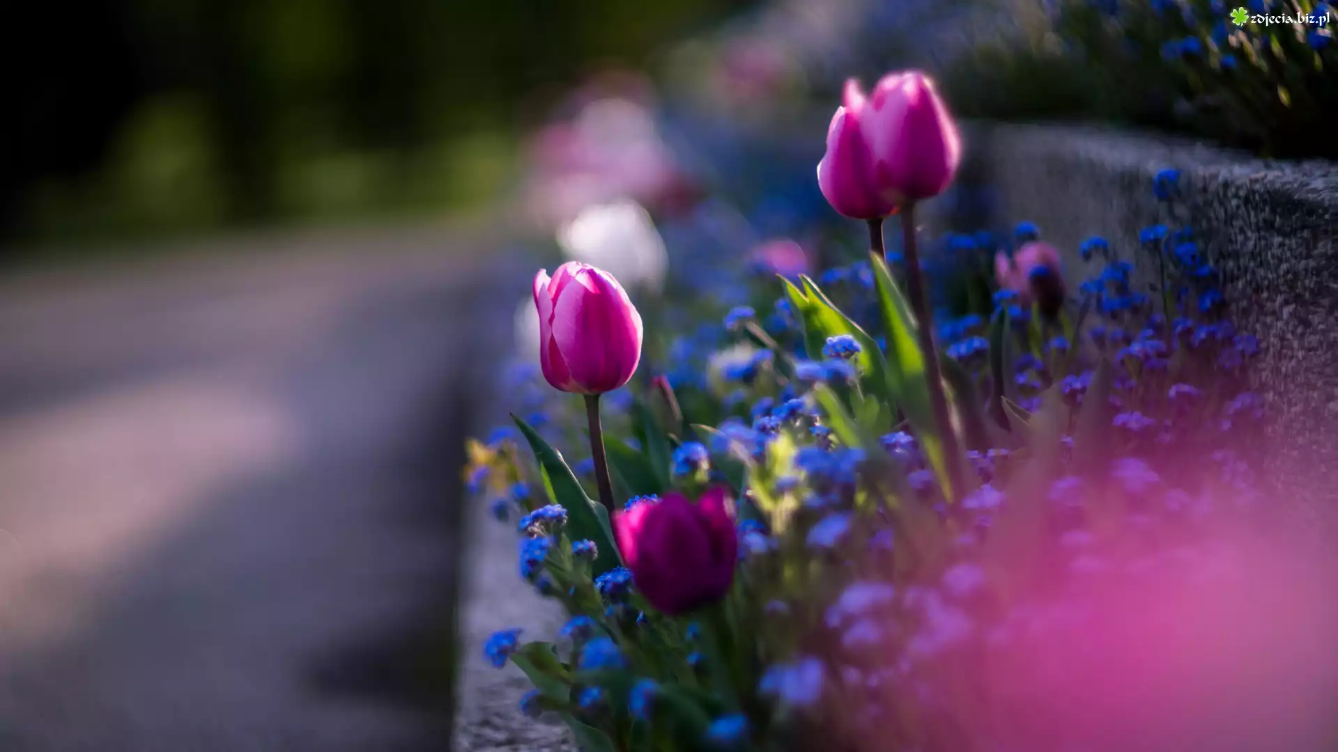 Zdjęcie Rabatka, Tulipany, Niezapominajki, Rozmyte, Tło, Makro