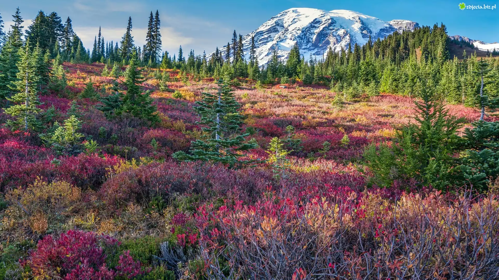 Zdjęcie Stany Zjednoczone, Waszyngton, Park Narodowy Mount Rainier, Stratowulkan, Mount Rainier, Łąka, Drzewa, Kolorowe, Rośliny, Góry, Chmury |