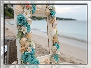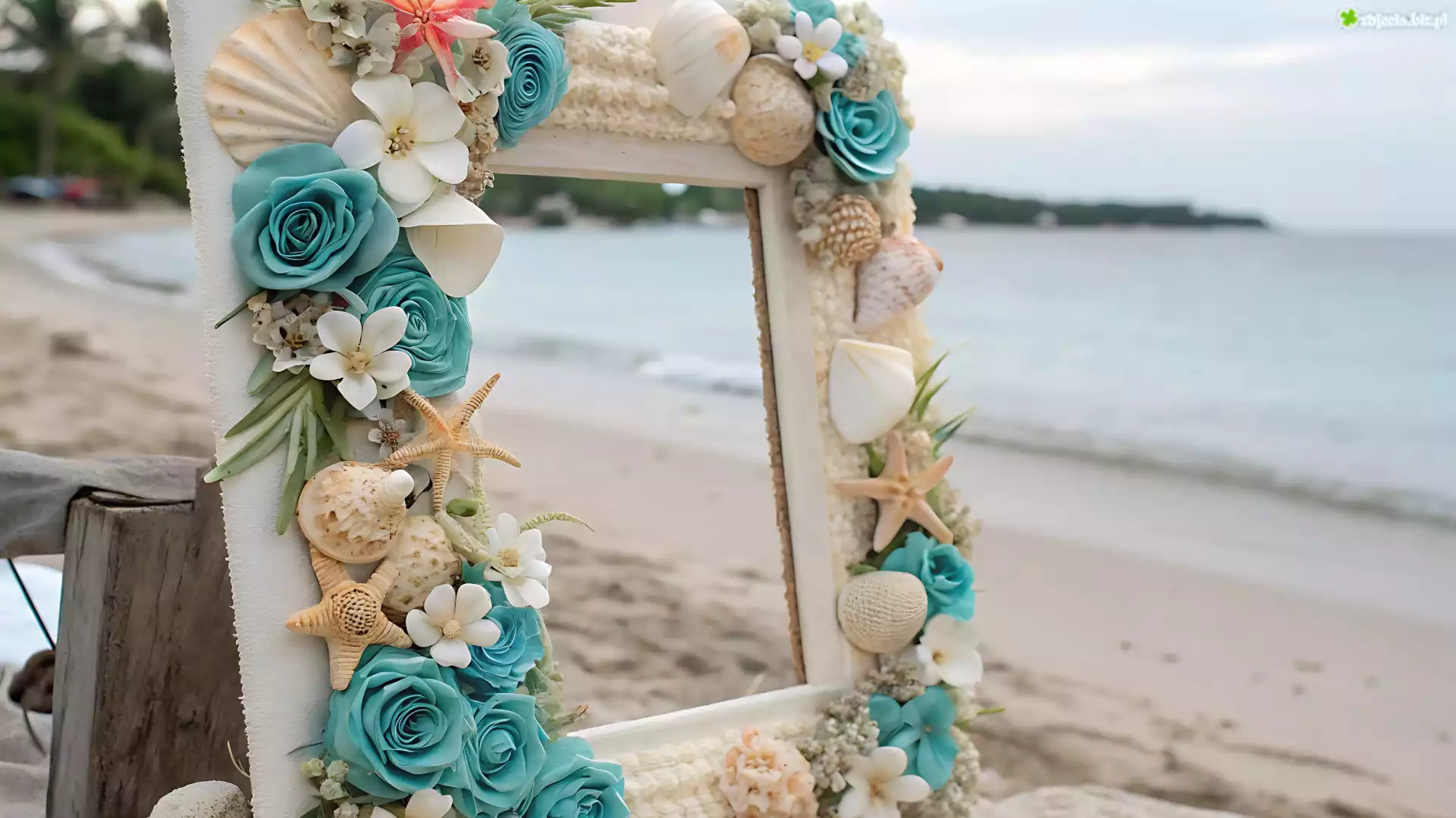 Zdjęcie Plaża, Morze, Piasek, Ramka, Muszle, Róże, Dekoracja