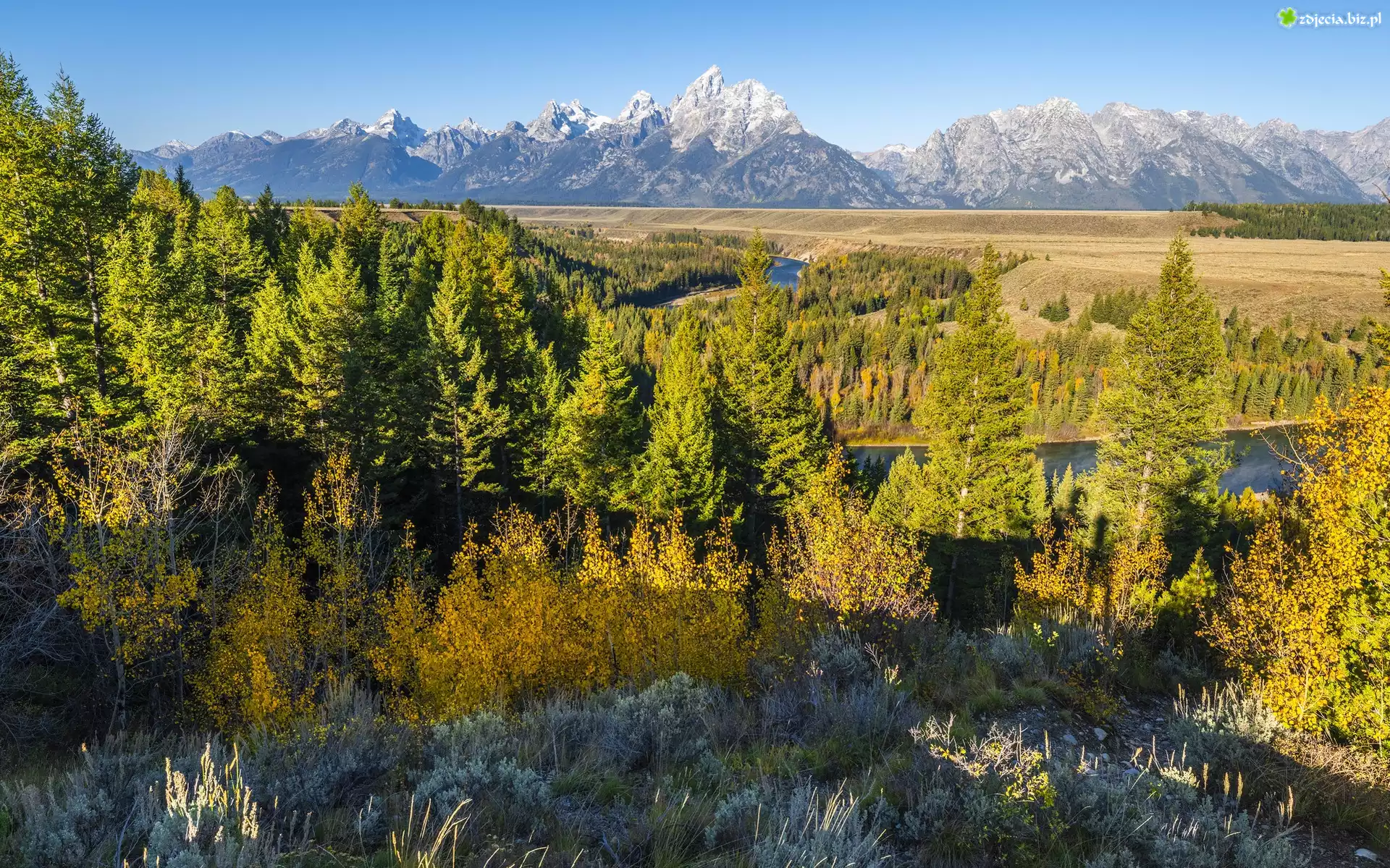 Zdjęcie Park Narodowy Grand Teton, Góry, Teton Range, Las, Drzewa, Rzeka Snake River, Stan Wyoming, Stany Zjednoczone |