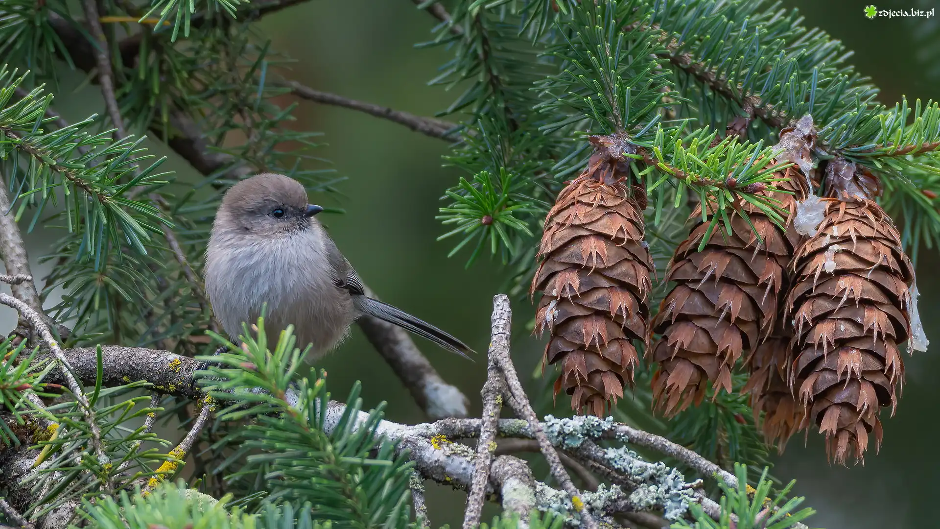 Zdjęcie Ptak, Raniuszek amerykański, Gałązki, Drzewo, Daglezja zielona, Szyszki