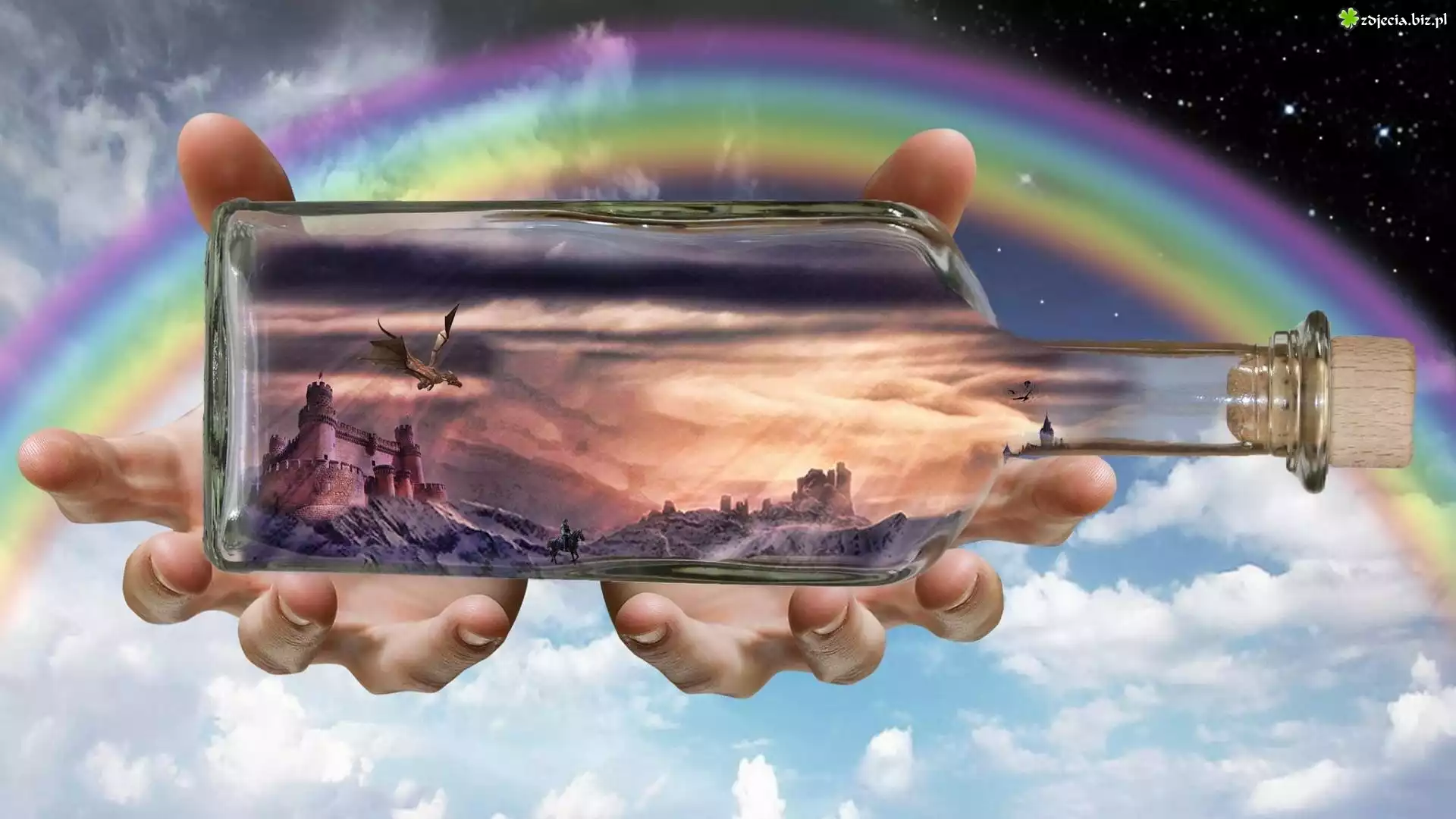 Zdjęcie Rafandynka, Ręce, Butelka, Tęcza, Chmury, Niebo, Fantasy