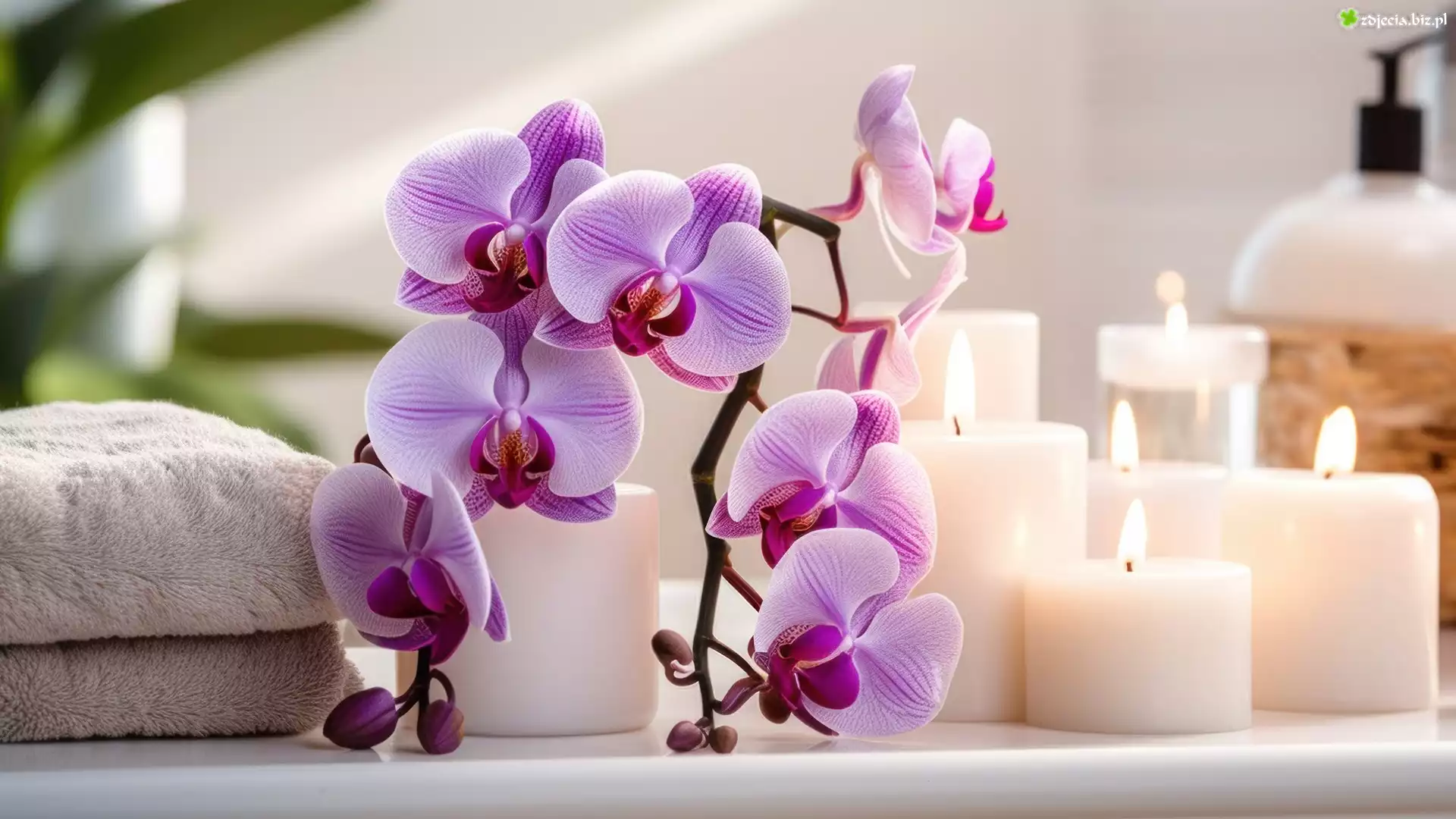 Zdjęcie Kwiat, Storczyk, Świece, Ręczniki, Relaks, Grafika