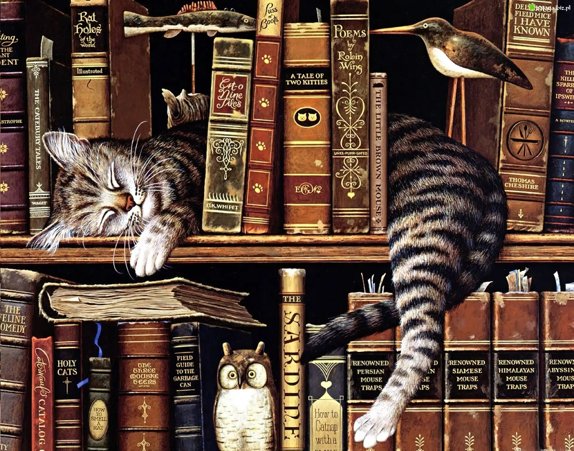 Zdjęcie Śpiący, Kot, Regał, Książki