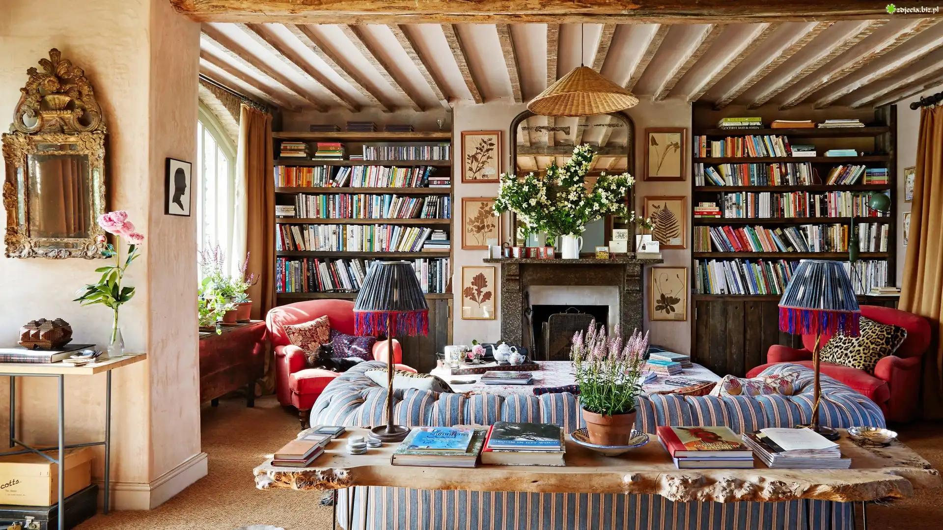 Zdjęcie Pokój, Regały, Książki, Biblioteczka, Kanapa, Fotele, Lampy