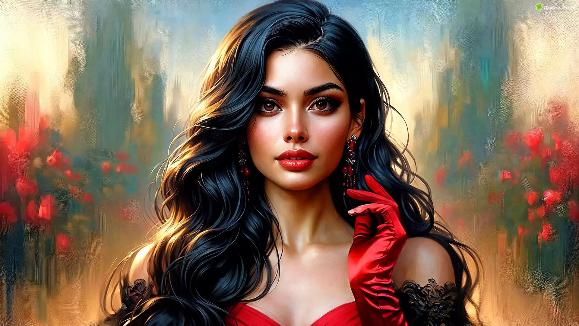 Zdjęcie Kobieta, Długowłosa, Brunetka, Rękawica, Czerwona, Kolczyki, Grafika