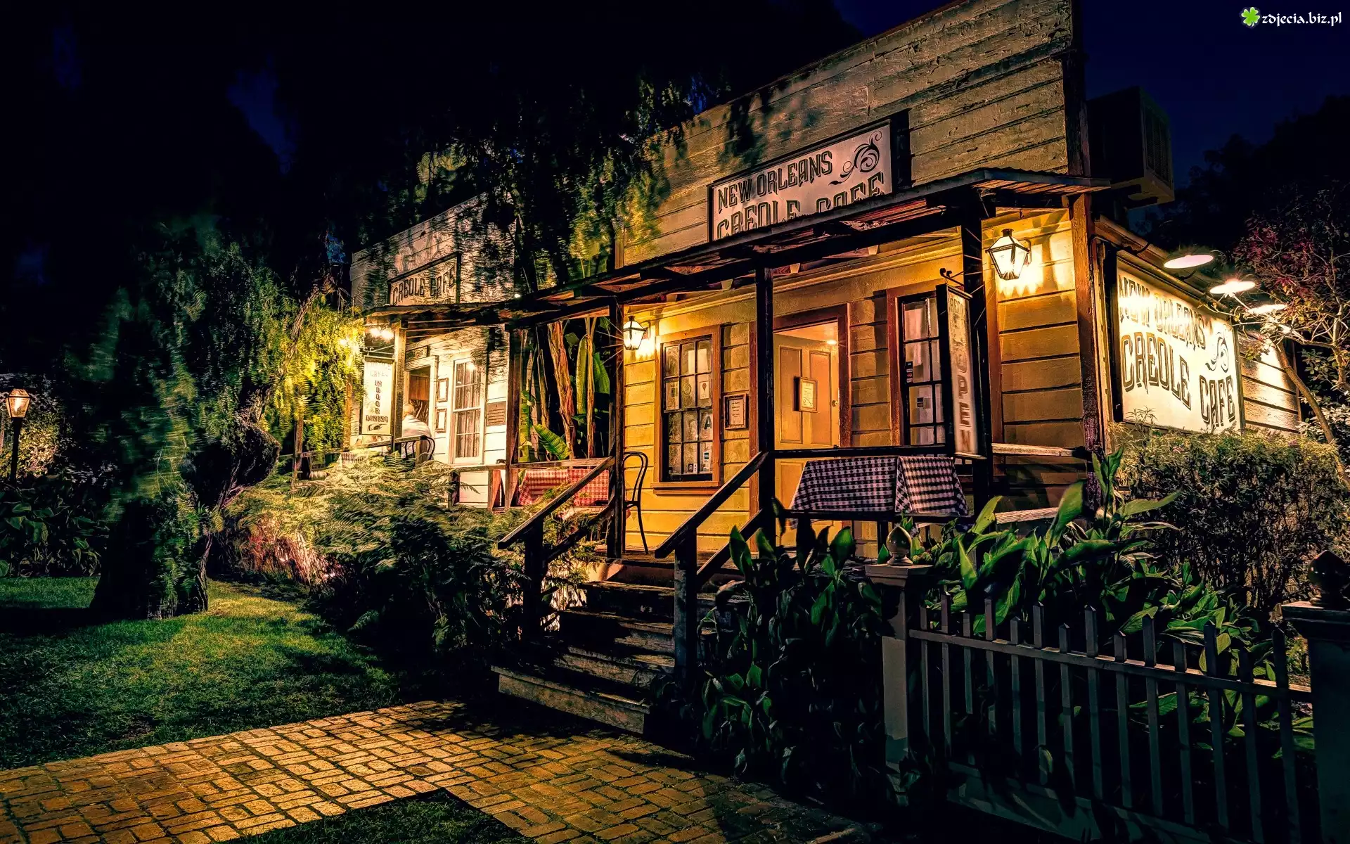 Zdjęcie, Restauracja, Dom, Schody, Stoliki, Drzewa, Ogródek
