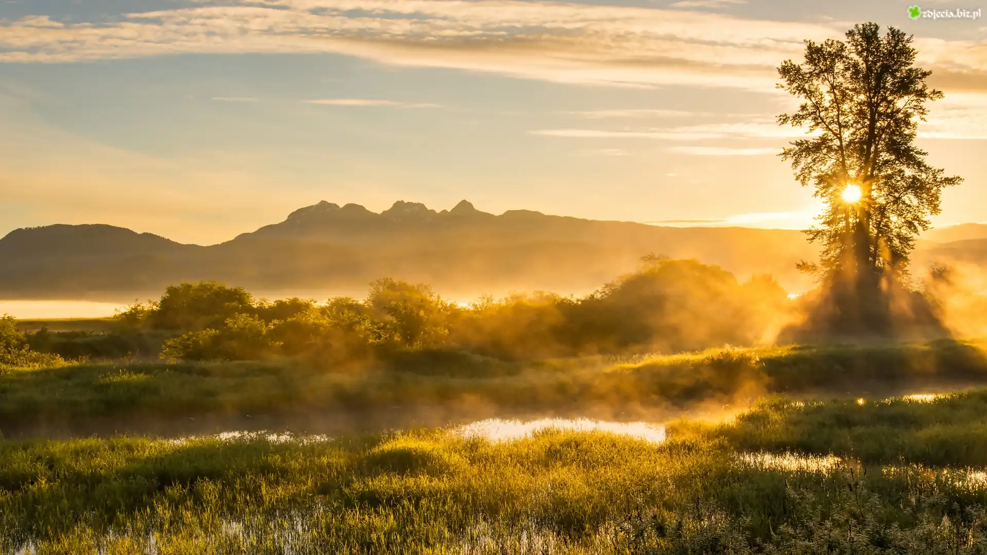 Zdjęcie Kanada, Kolumbia Brytyjska, Maple Ridge, Jerry Sulina Park, Drzewa, Mgła, Wschód słońca, Wzgórza, Drzewo |