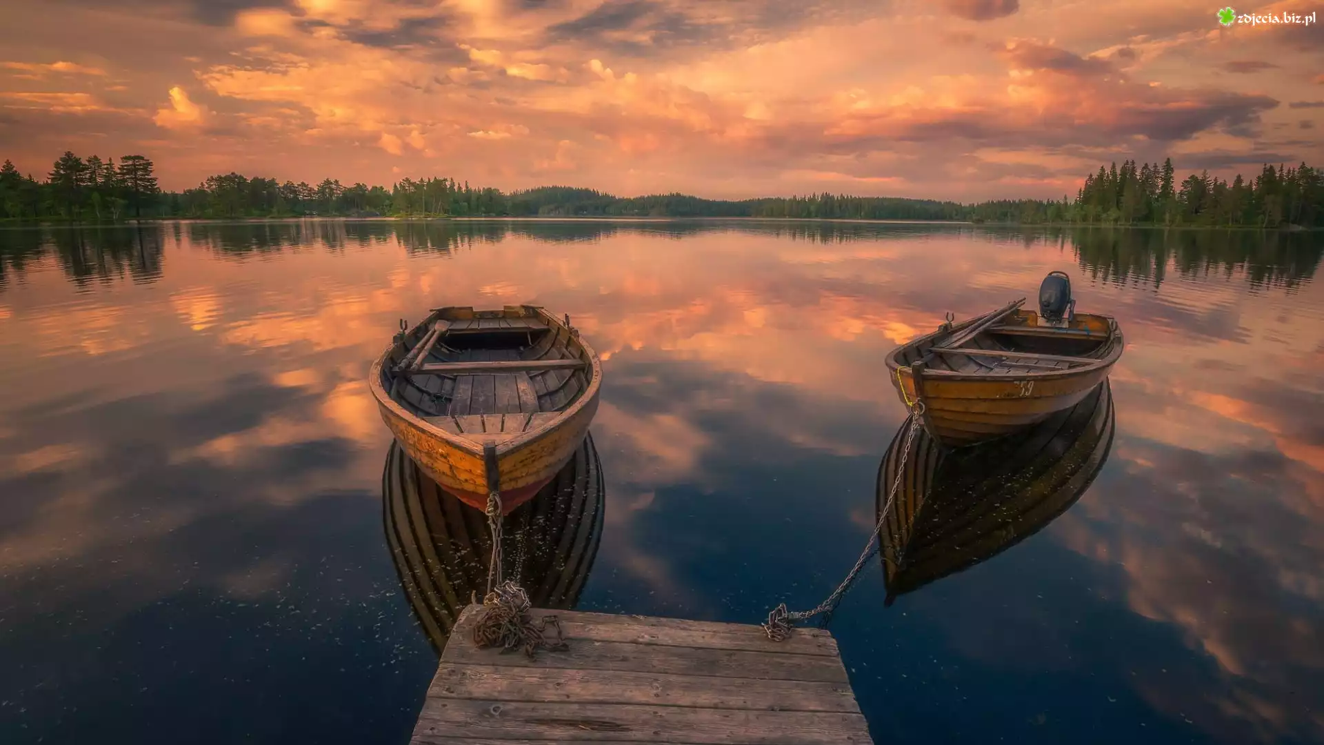 Zdjęcie Norwegia, Ringerike, Łódki, Jezioro, Pomost, Zachód Słońca