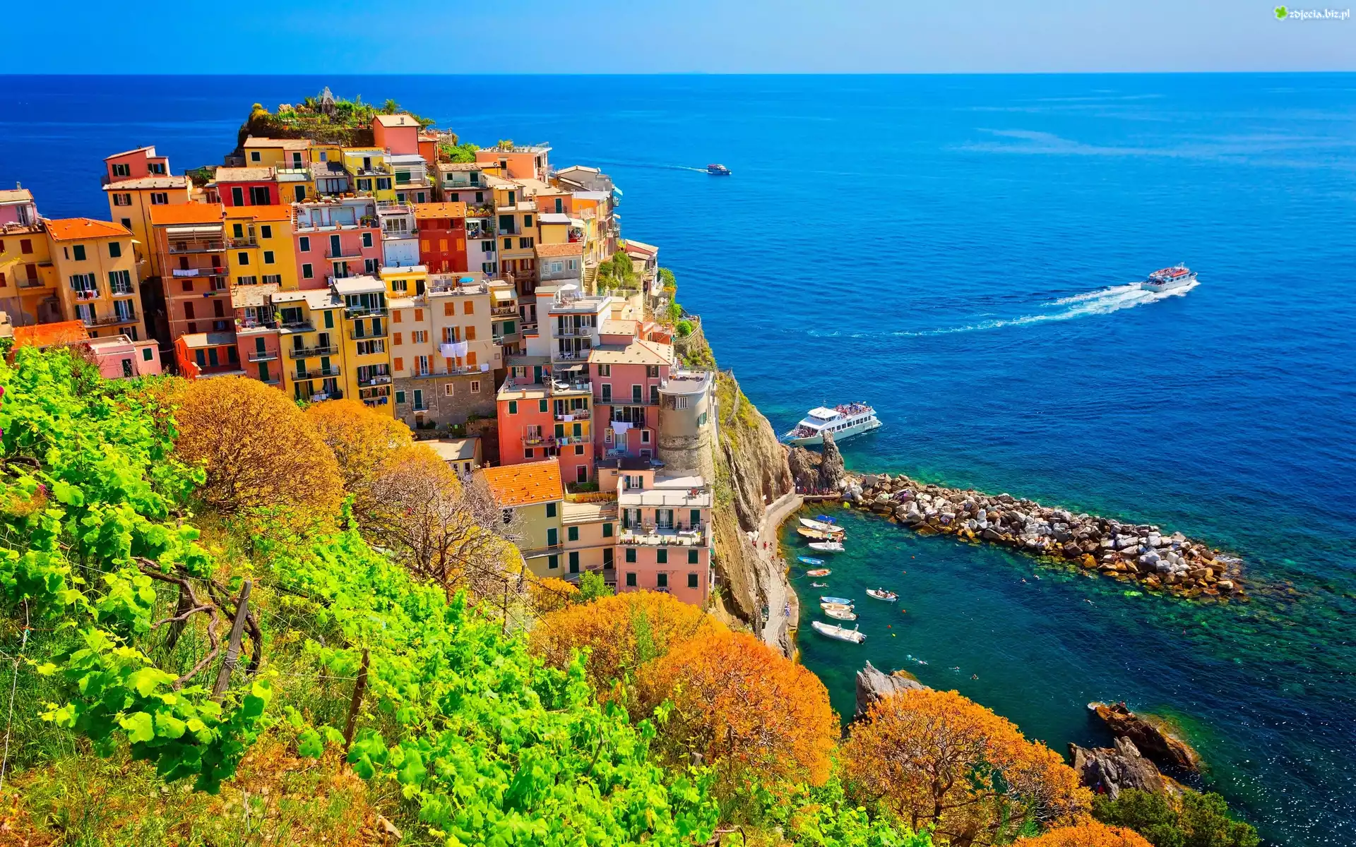 Zdjęcie Włochy, Gmina Riomaggiore, Manarola, Wybrzeże, Morze Liguryjskie, Kolorowe, Domy, Drzewa, Statki |