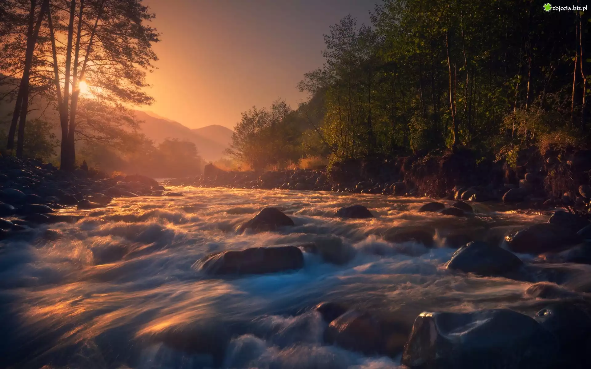 Zdjęcie, Rzeka Rioni, Kamienie, Zachód słońca, Mgła, Gruzja