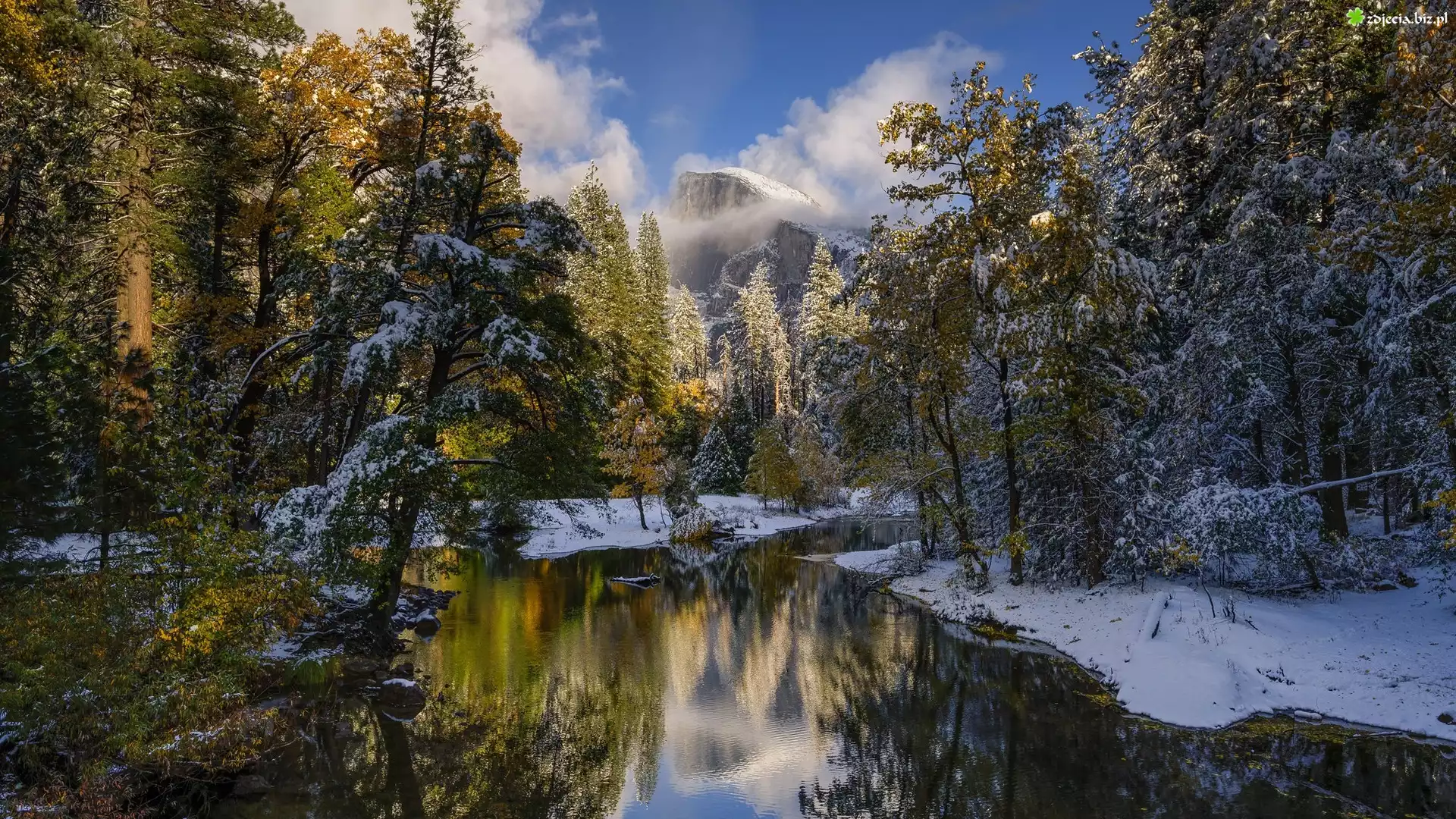 Zdjęcie Park Narodowy Yosemite, Rzeka, Merced River, Góry, Drzewa, Śnieg, Kalifornia, Stany Zjednoczone |