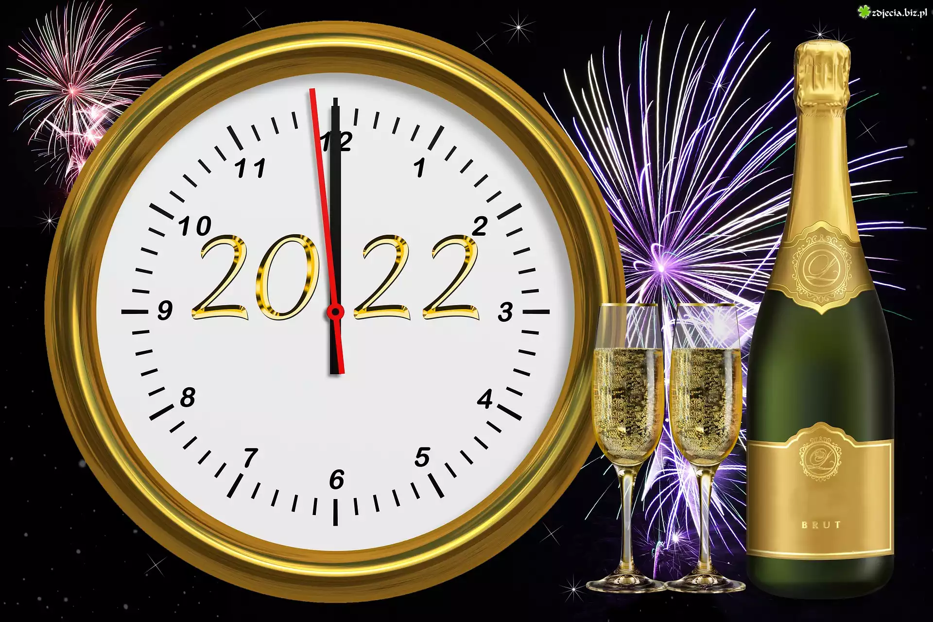 Zdjęcie Zegar, Data, 2022, Szampan, Kieliszki, Fajerwerki, Nowy, Rok