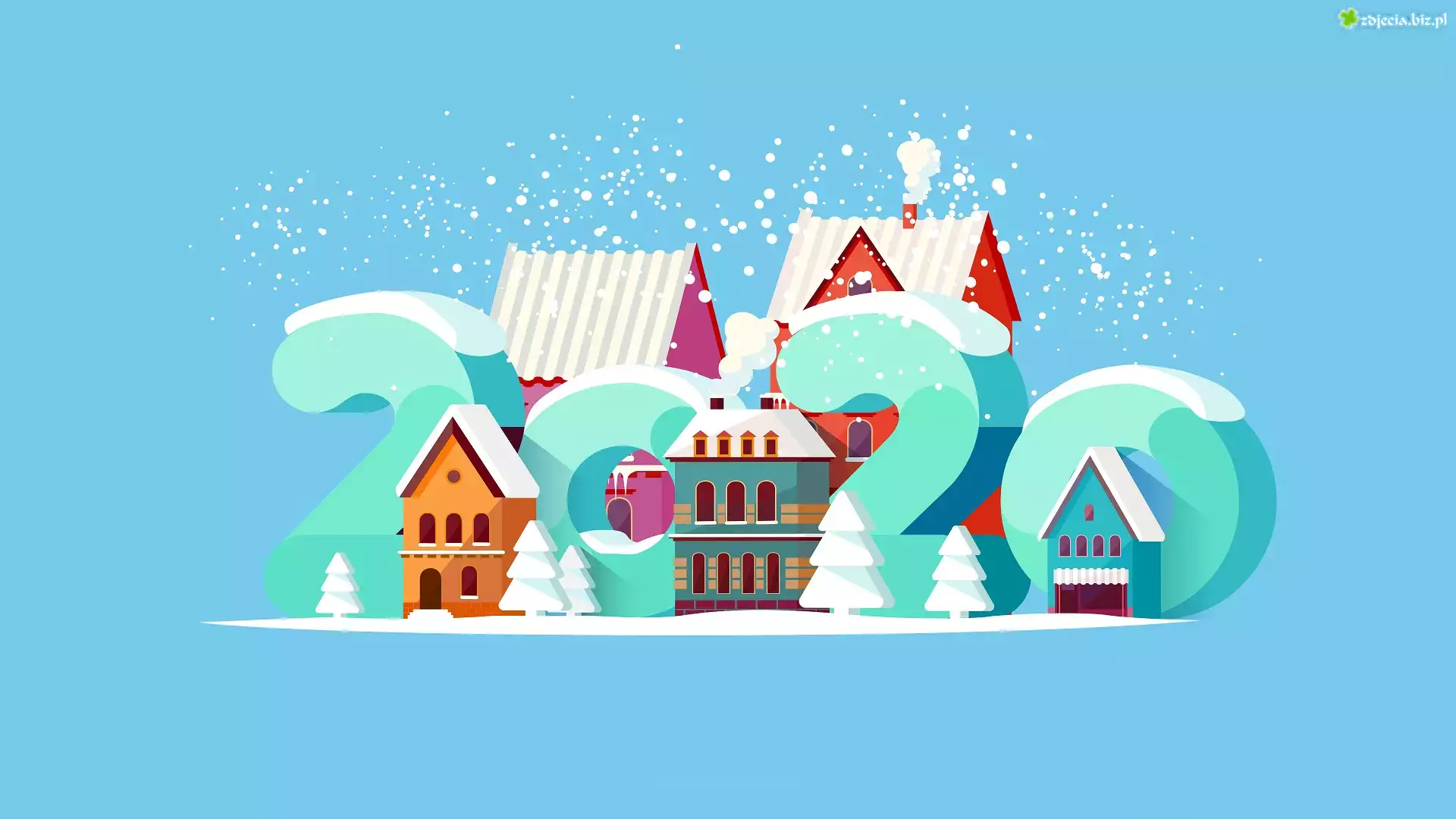 Zdjęcie Nowy Rok, 2020, Ośnieżone, Cyfry, Domy, Choinki, Śnieg