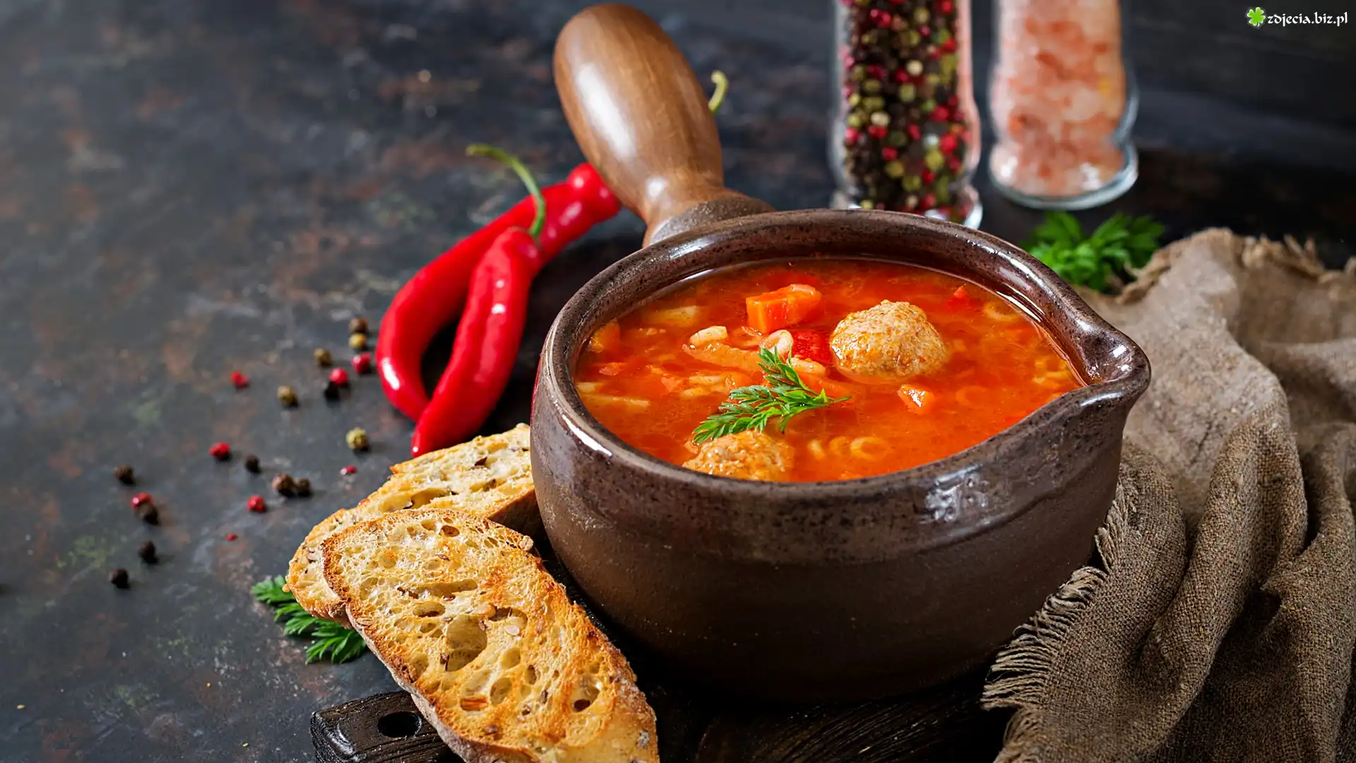 Zdjęcie Rondel, Zupa, Pomidorowa, Klopsiki, Chleb