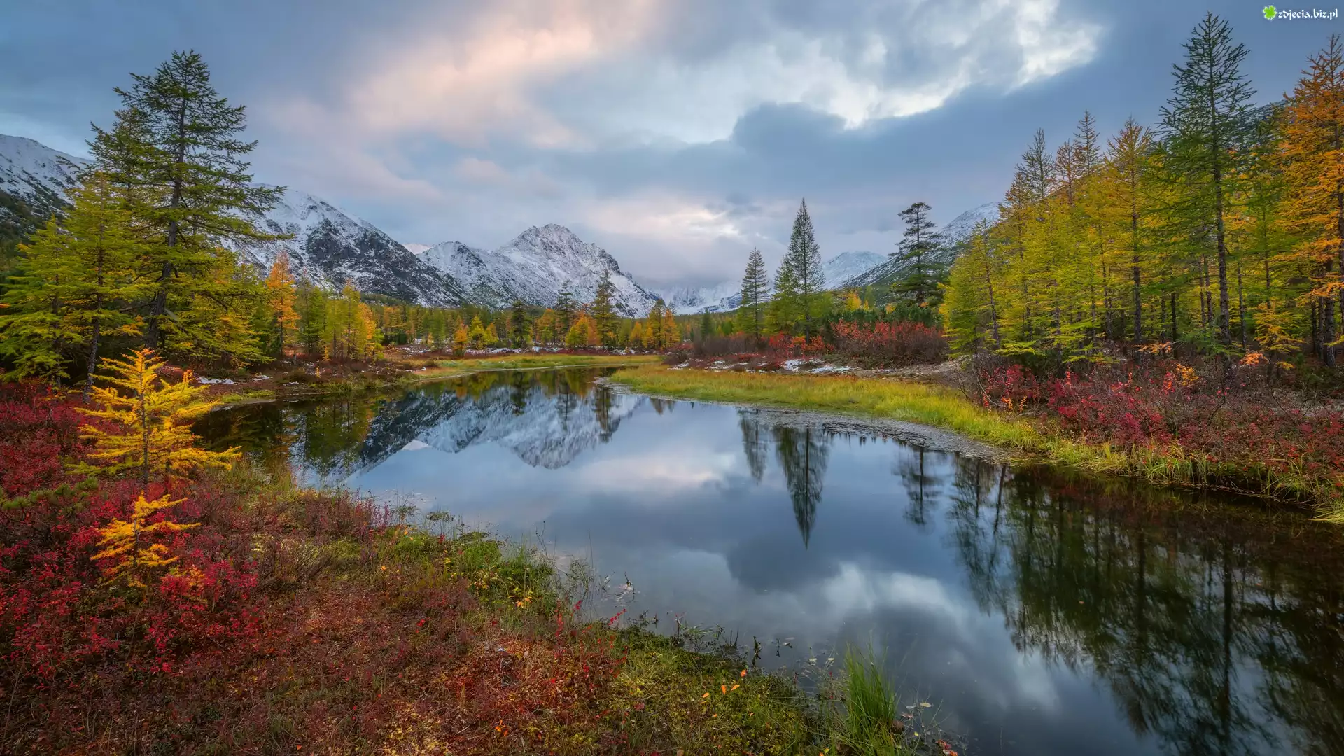 Zdjęcie Rosja, Obwód magadański, Kołyma, Góry, Rzeka, Jesień, Drzewa, Chmury, Roślinność
