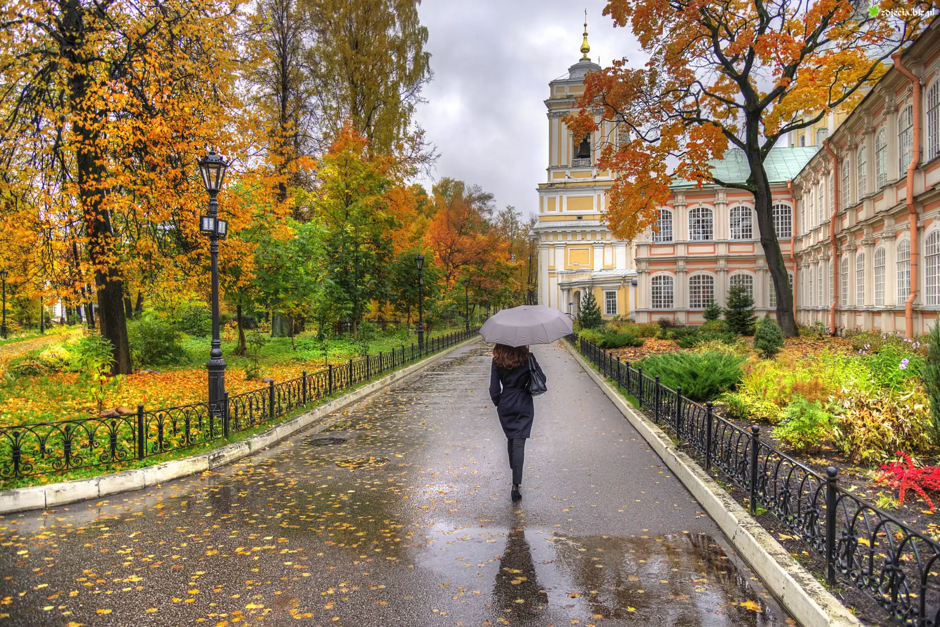 Zdjęcie Rosja, Petersburg, Ławra Aleksandra Newskiego w Petersburgu, Klasztor, Jesień, Kobieta, Parasol, Park, Alejka, Drzewa, Liście |