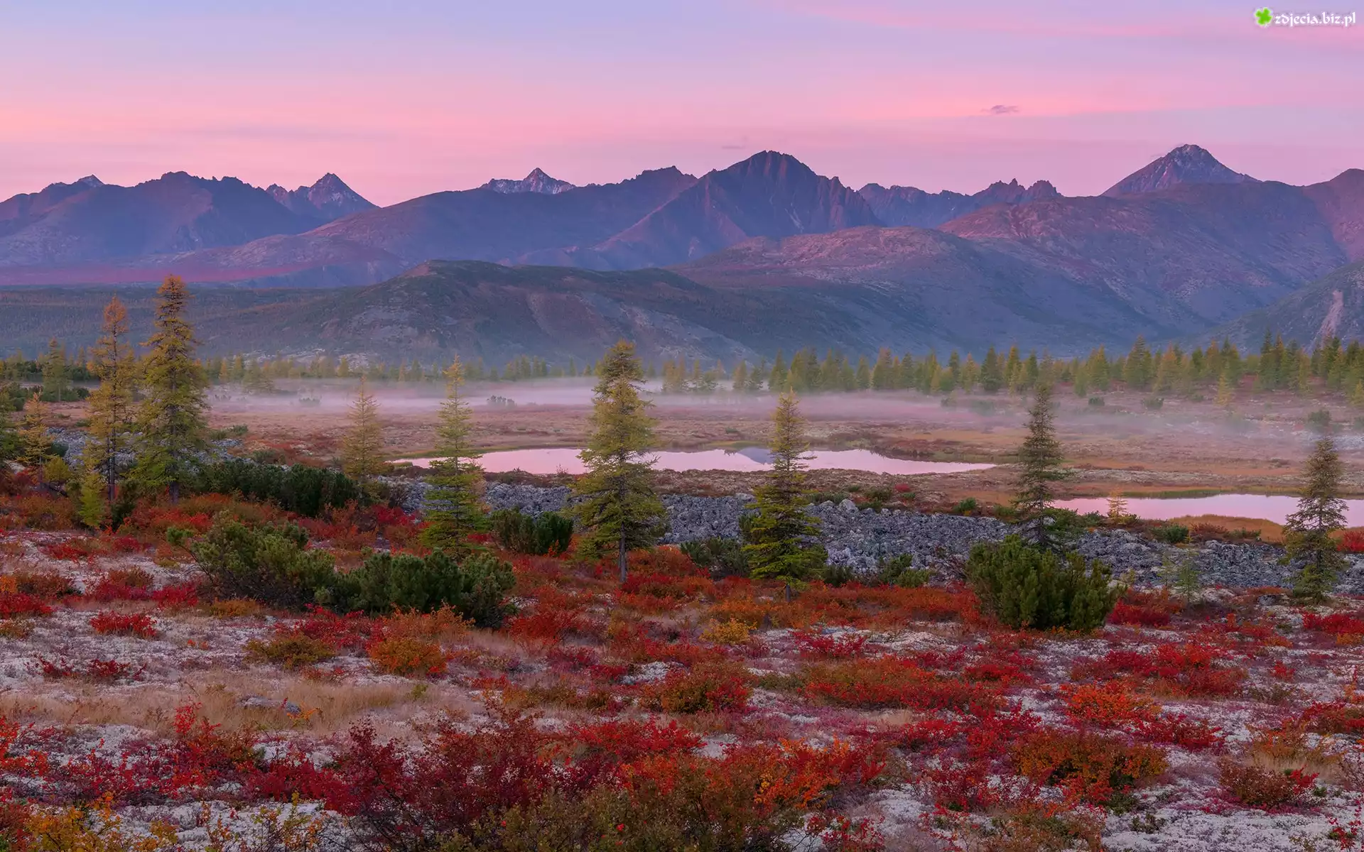 Zdjęcie Góry Kołymskie, Drzewa, Czerwone, Rośliny, Kołyma, Obwód magadański, Rosja