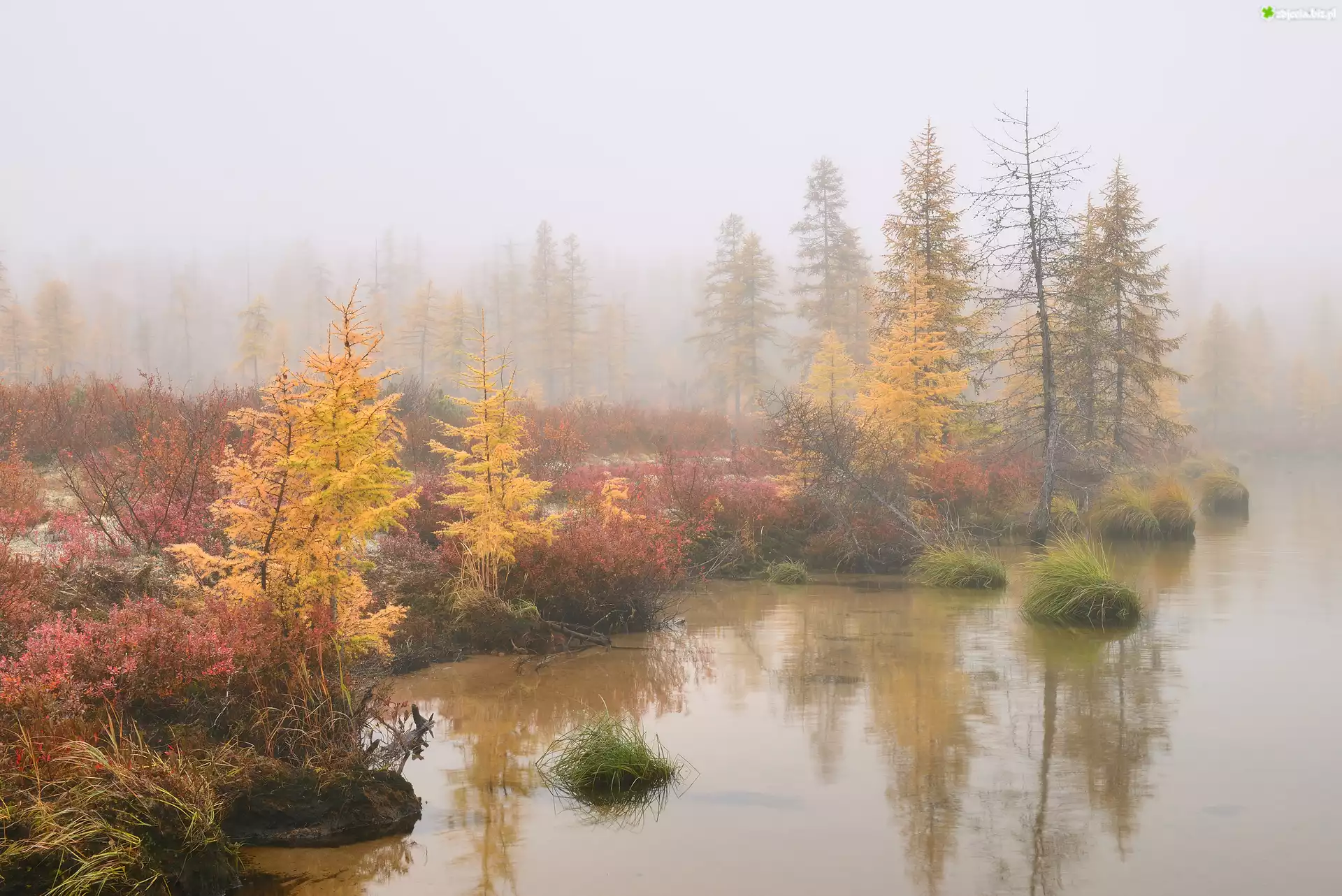 Zdjęcie, Jesień, Mgła, Drzewa, Jezioro Jack London, Kołyma, Obwód magadański, Rosja