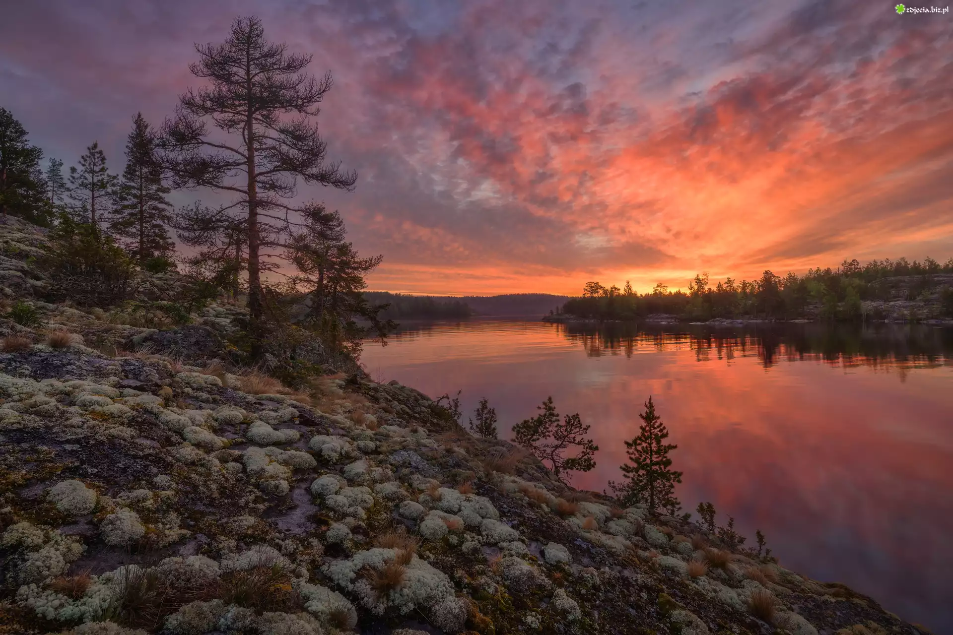 Zdjęcie Zachód słońca, Jezioro, Ładoga, Kamienie, Drzewa, Karelia, Rosja