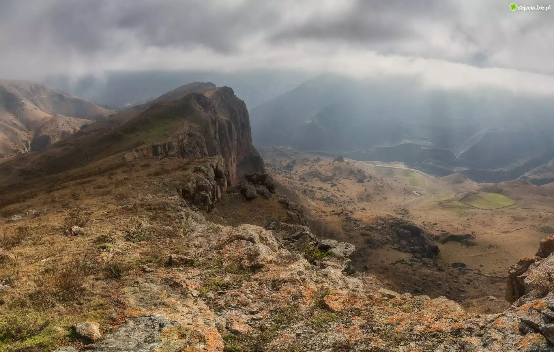 Zdjęcie Góry, Kaukaz, Mgła, Kamienie, Rośliny, Wąwóz, Kabardo-Bałkaria, Rosja